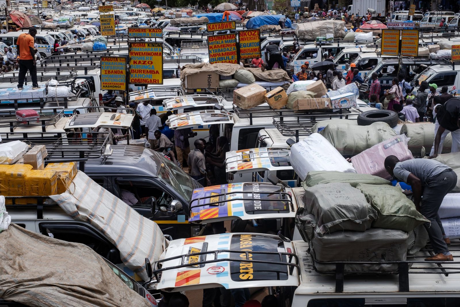 Engines idle in long rows of white commuter minibuses, their blue stripes marking them as Uganda’s public service taxis. They sit bumper-to-bumper, noses pointed toward narrow exits that will soon release them into the morning rush. Conductors slap the metal sides of vans and shout destinations into the dusty air.