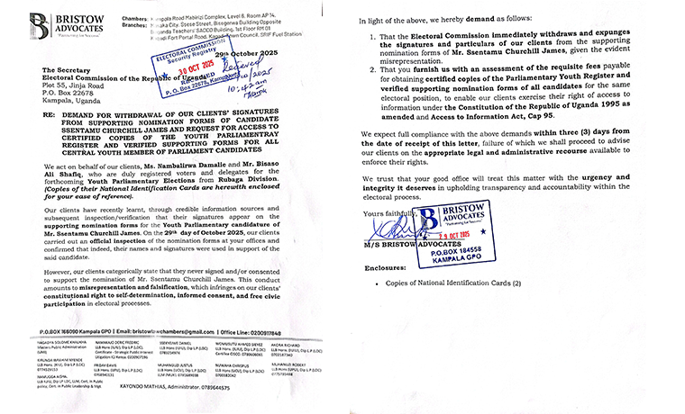 Through their lawyers Bristow Advocates, based on Mabirizi Complex, the duo has written to the EC Secretary accusing Churchhill Ssentamu of leveraging their forged signatures in order to facilitate his nomination. They say that such acts are criminal and violate their right to effectively exercise their franchise rights.