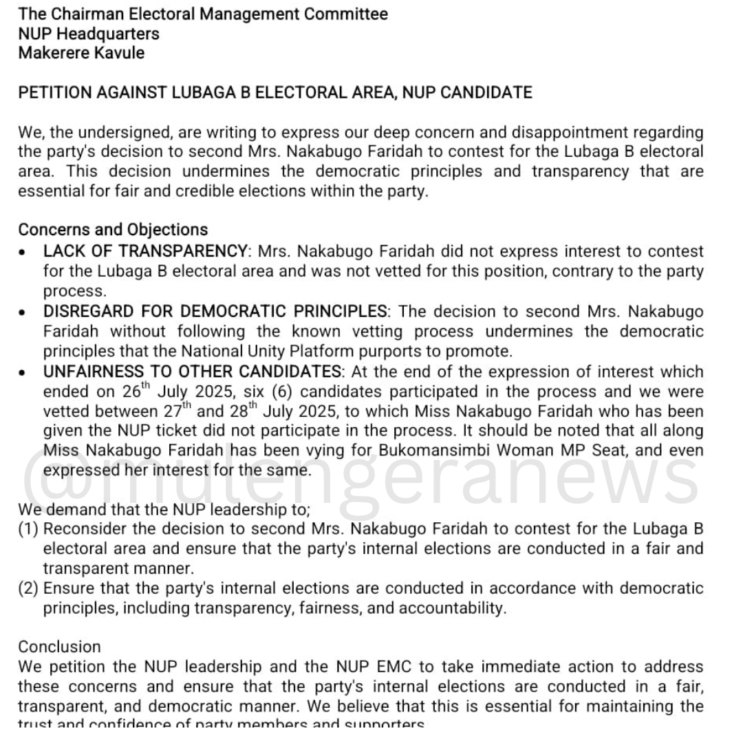 The National Unity Platform (NUP) is facing criticism for its decision to favour Mrs. Nakabugo Faridah as the candidate for the Lubaga B electoral area. A petition signed by several party members has raised concerns about the party’s commitment to democratic principles and transparency.