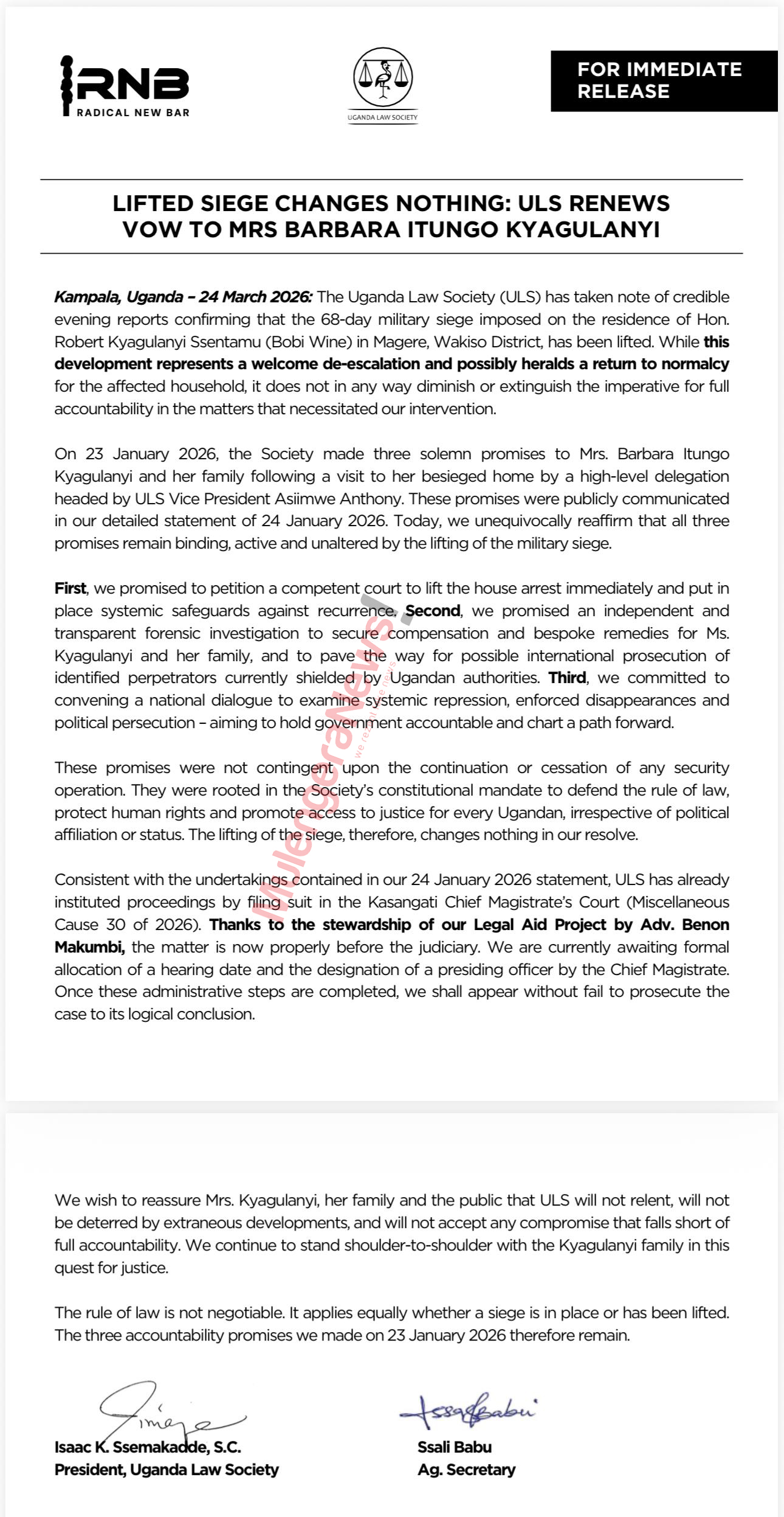 In a statement issued today morning signed by Ssemakadde and ULS Acting Secretary Ssali Babu, the society says it made three serious commitments back in January, and it is standing by every single one of them. First, it wants the courts to step in decisively to prevent any future house arrests. Second, it is pushing for a full-scale independent investigation that could expose those responsible and even open the door to international prosecution. Third, it is calling for a national conversation about what it describes as growing repression, disappearances, and political persecution in the country.