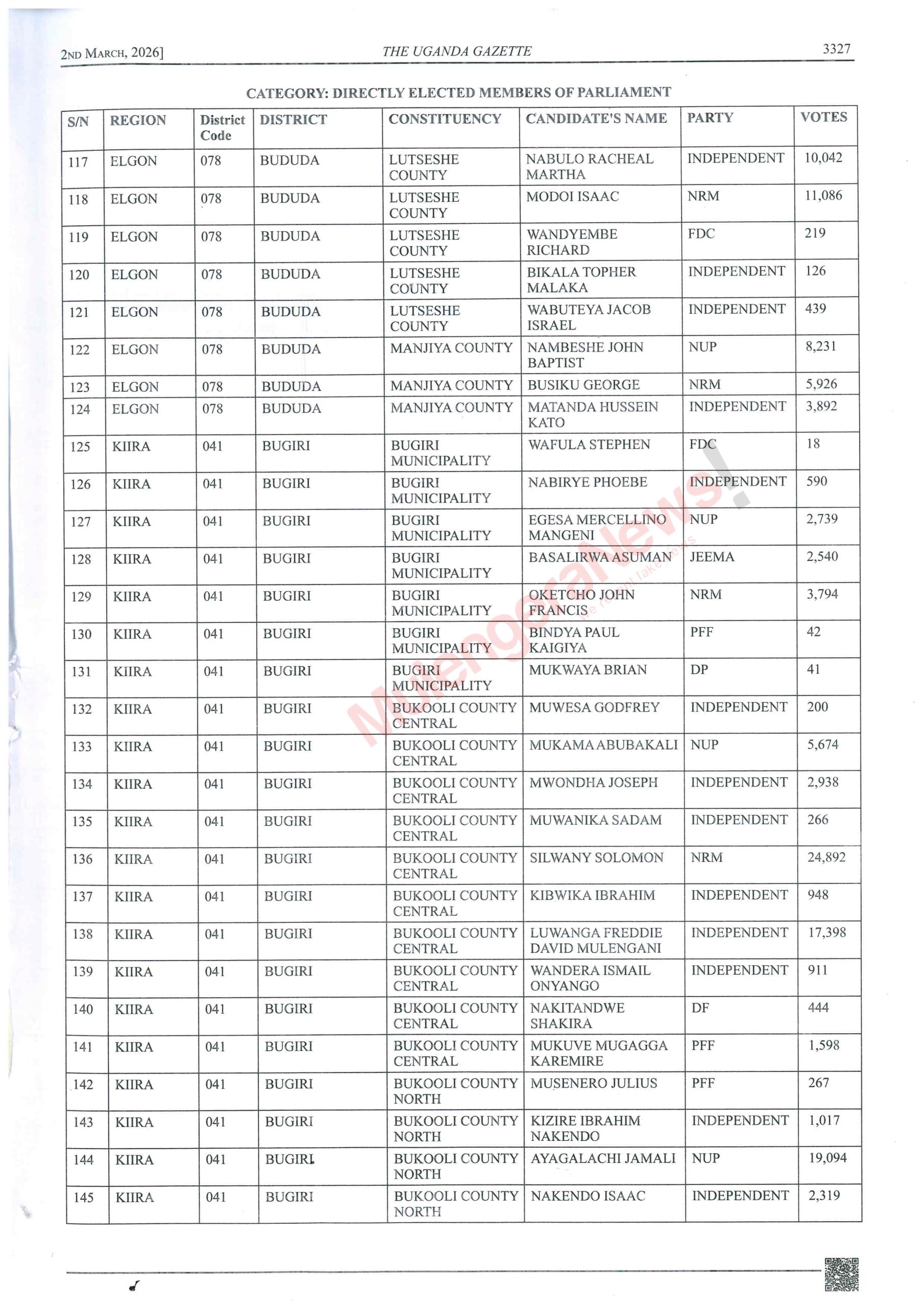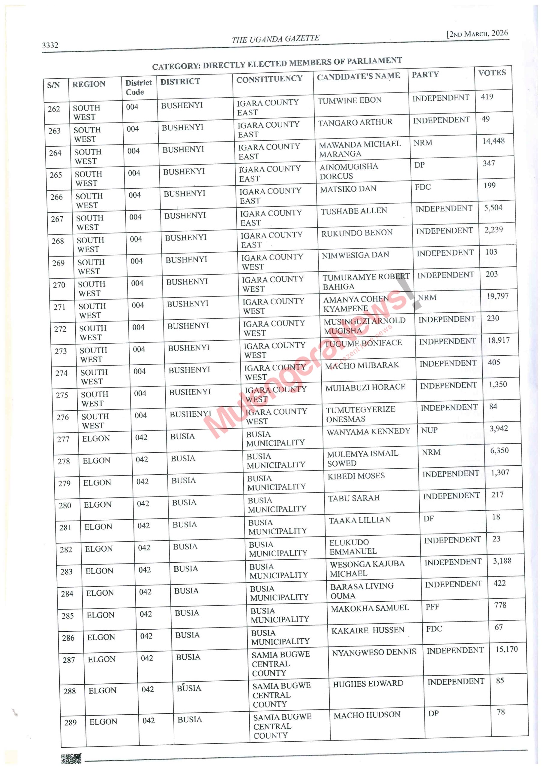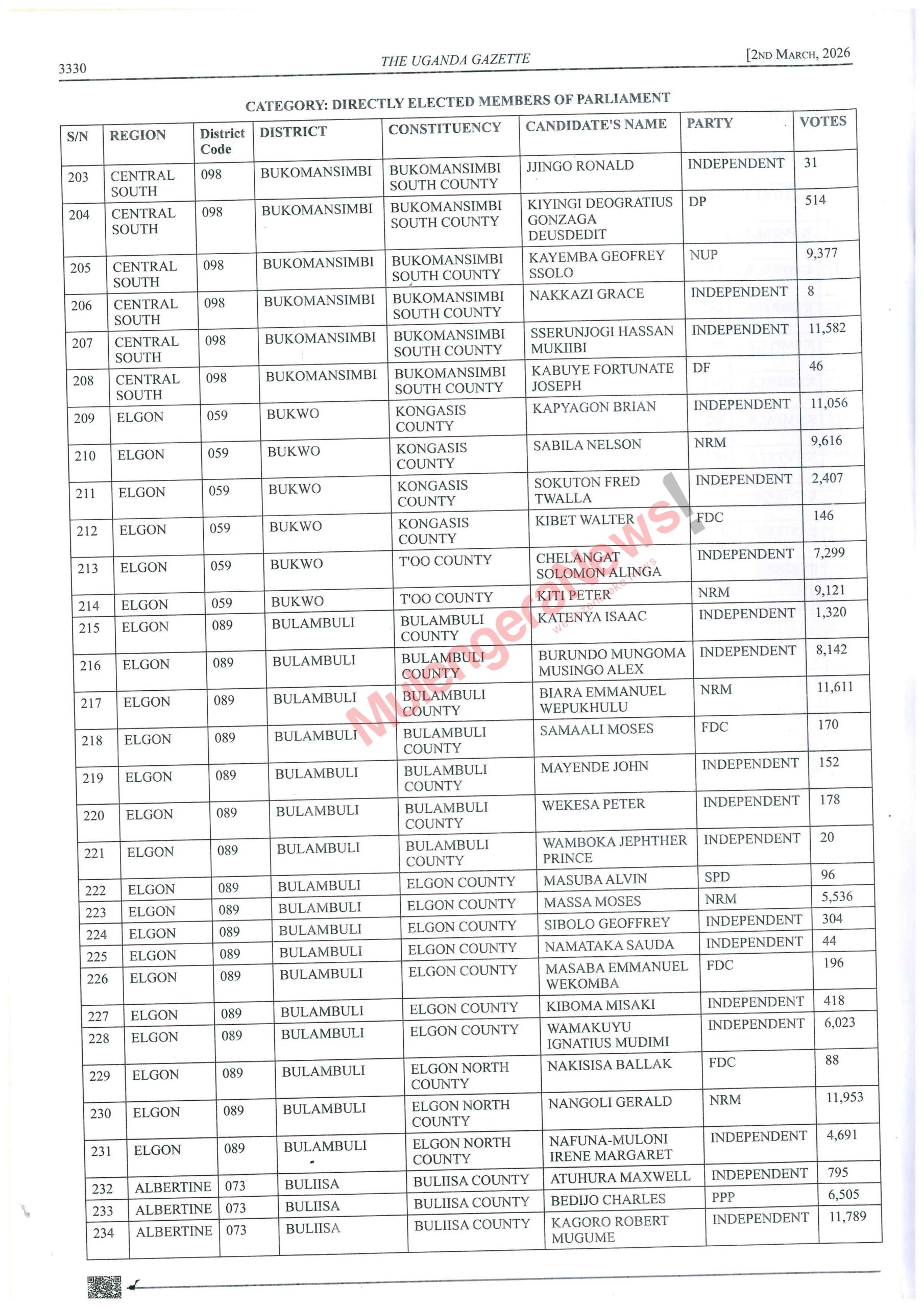 Let’s peruse the lists and know who won narrowly and those who lost narrowly. There are some contestants like Kalungu West’s Joseph Sewungu who won with a margin of as low as 26 votes. Equally true, there are candidates who lost and were beaten with a vote difference of as low as 10 votes. It hurts but it happens. Let’s acquaint ourselves with such details and much more by accessing the contents of the latest Gazette by perusing this story.