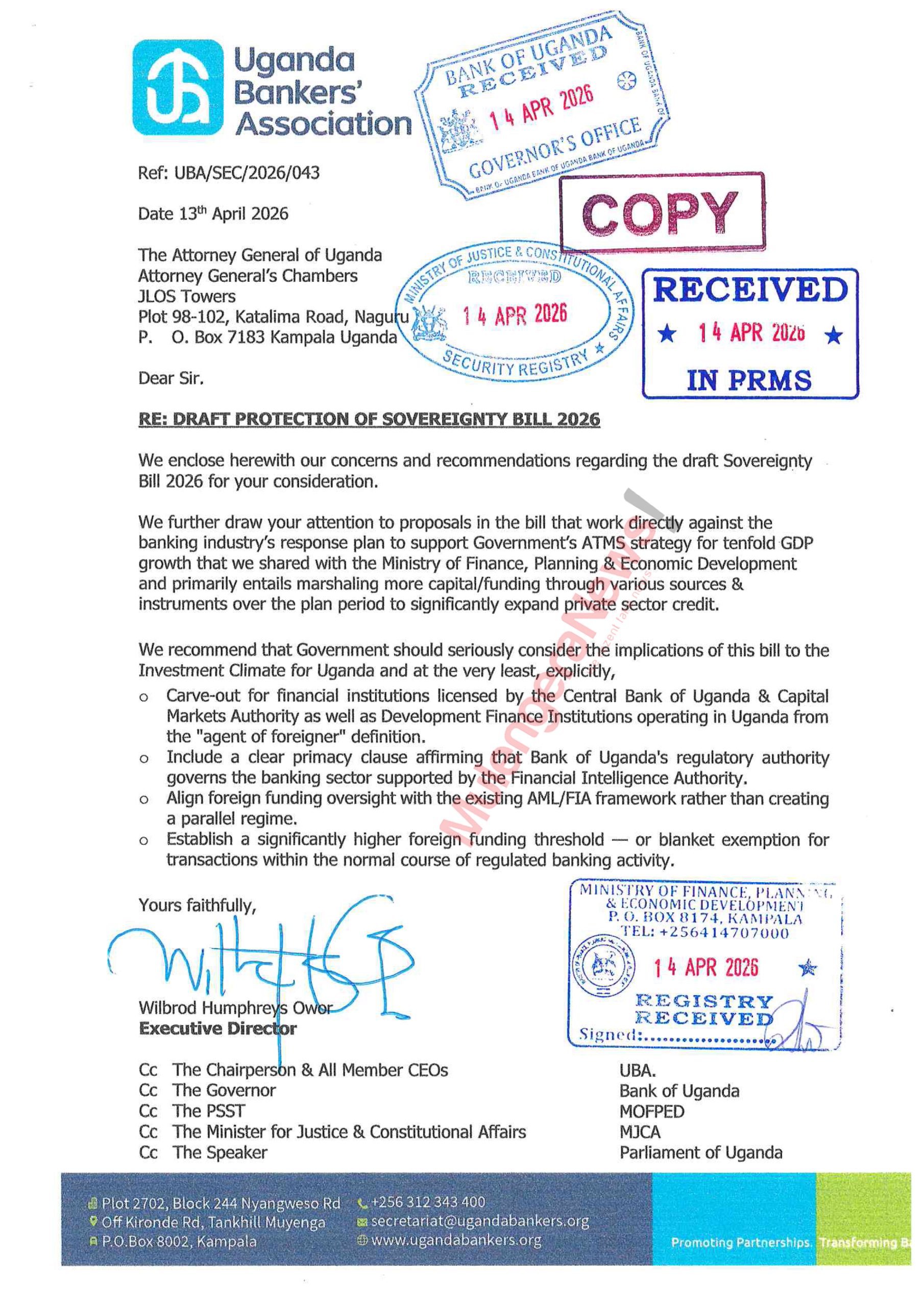 In a detailed submission to the Attorney General dated April 13, 2026, the Uganda Bankers Association (UBA) raised red flags about multiple clauses in the draft law, urging government to urgently revise the bill. The letter, signed by Executive Director Wilbrod Humphreys Owor, was also copied to key institutions including the Bank of Uganda, the Ministry of Finance Planning and Economic Development, Parliament, and the Ministry of Justice and Constitutional Affairs.
