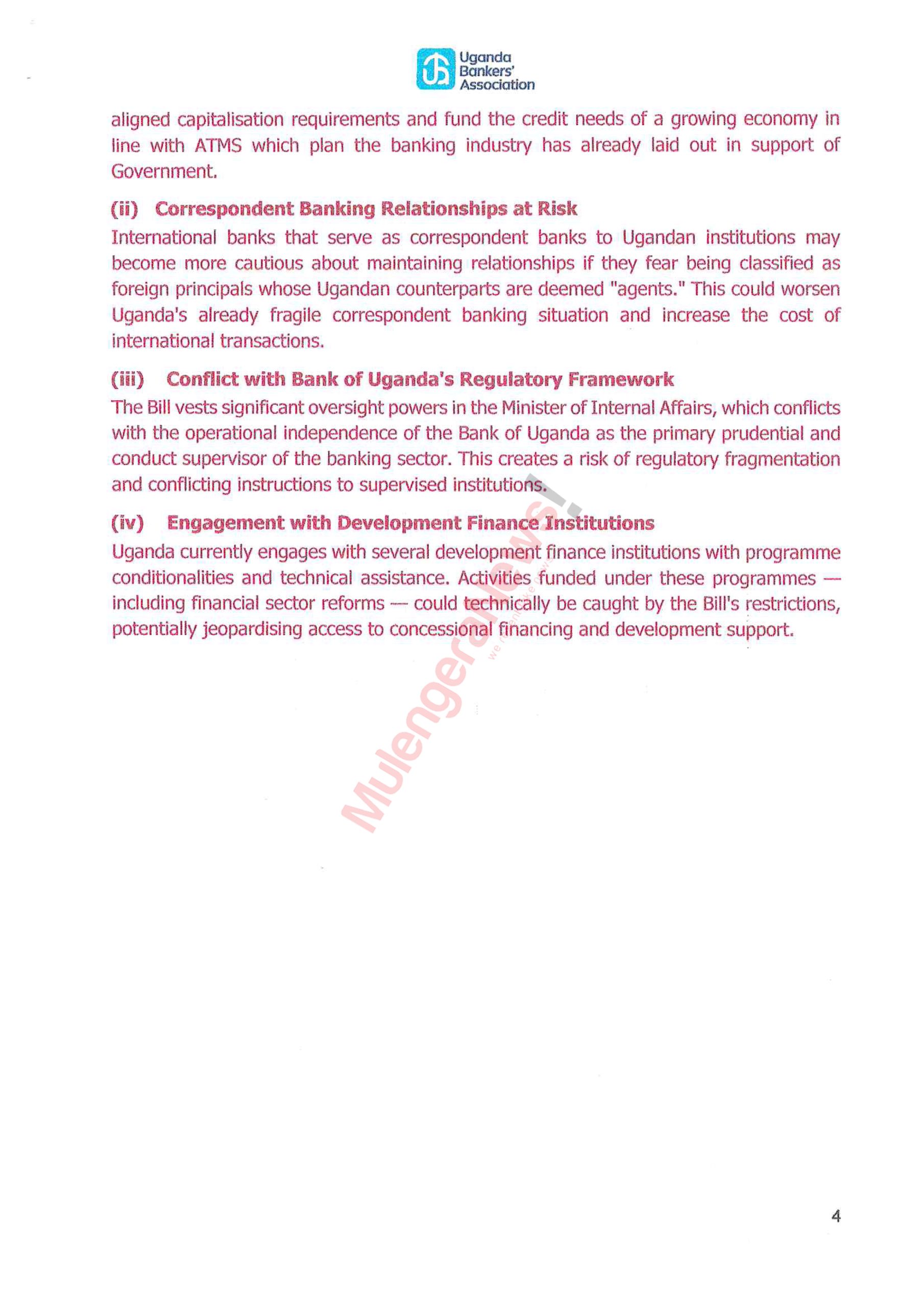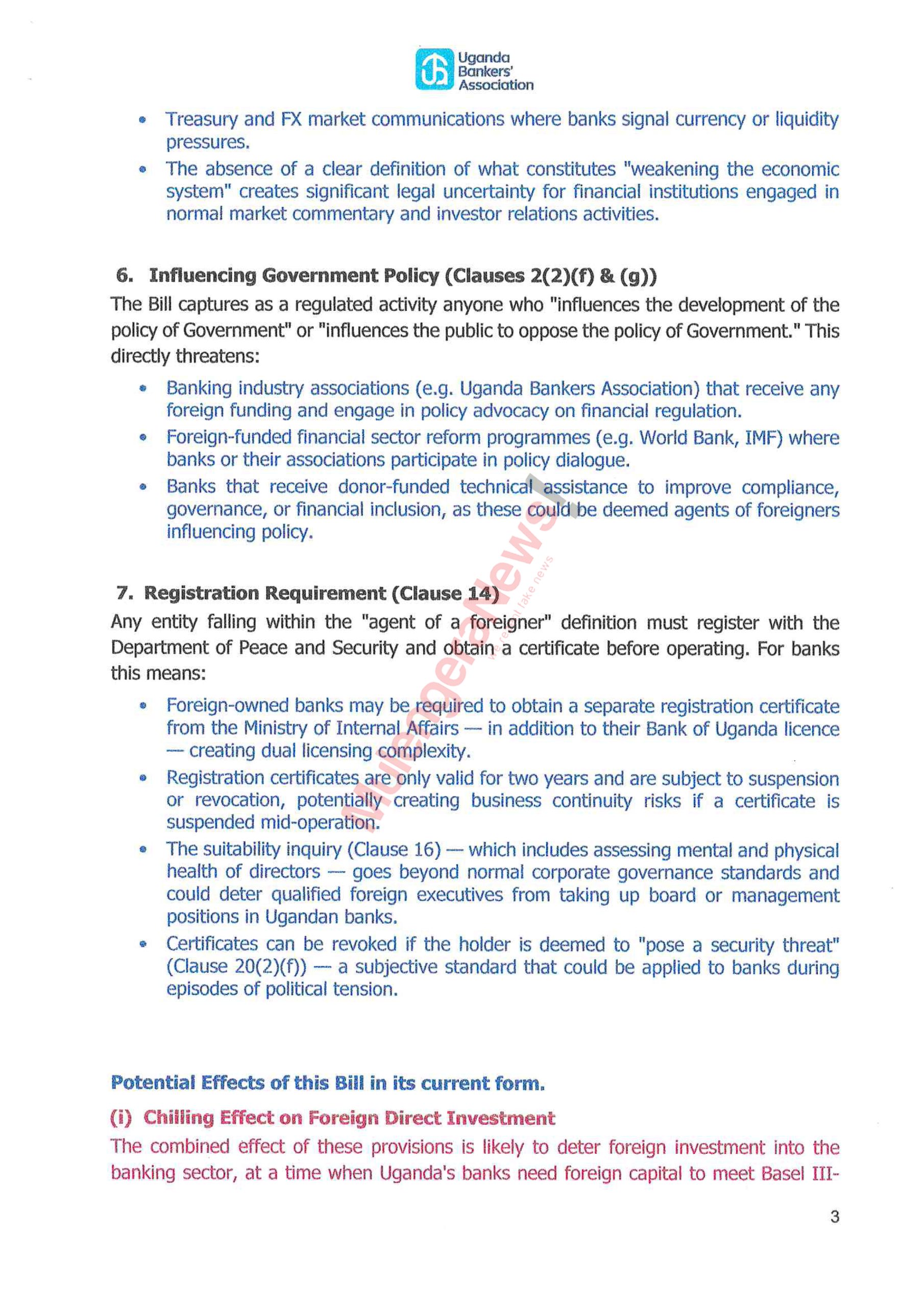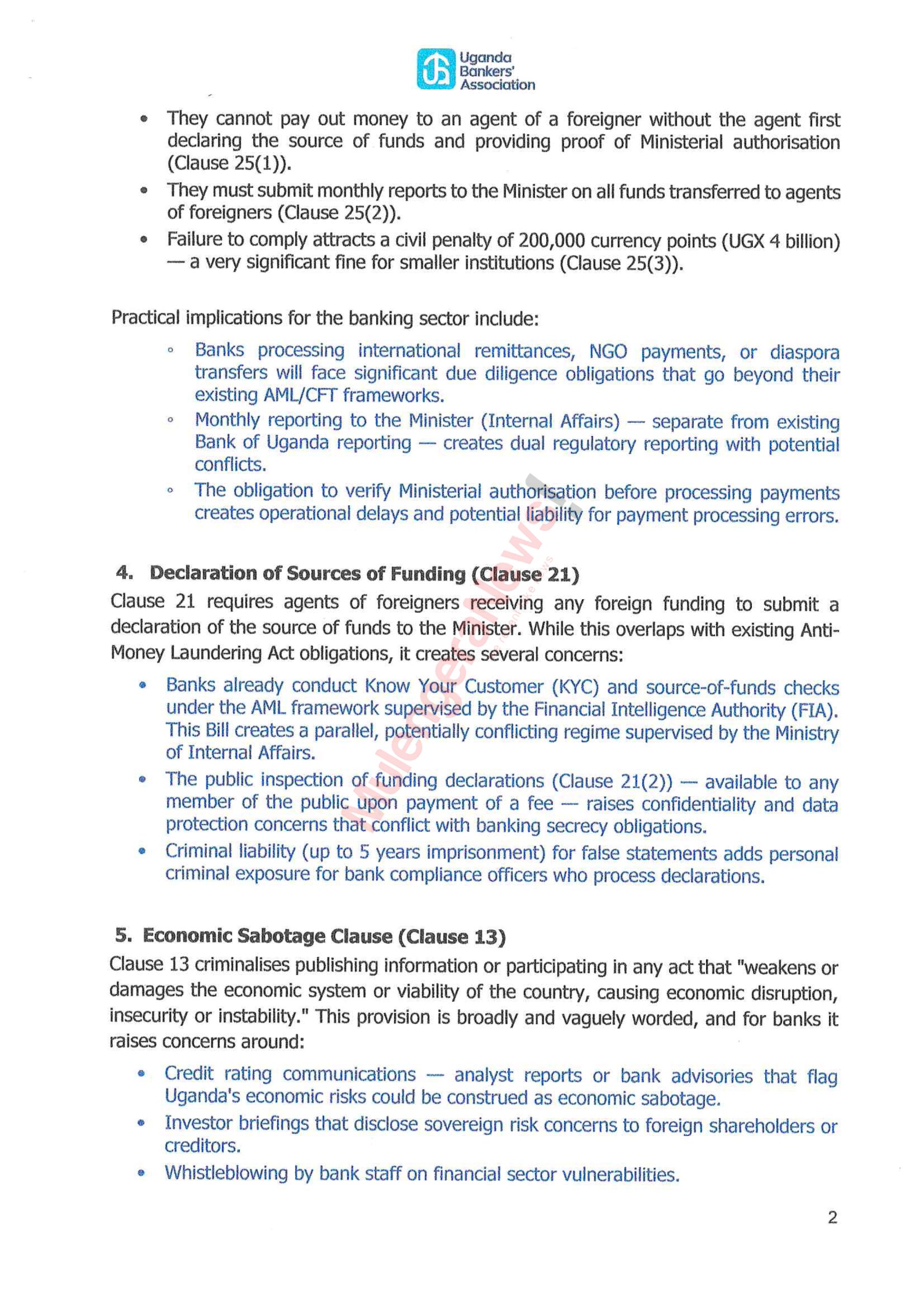 The association warned that, taken together, these provisions could trigger a chilling effect on foreign direct investment, strain correspondent banking relationships, and fragment regulatory oversight in Uganda’s financial sector.