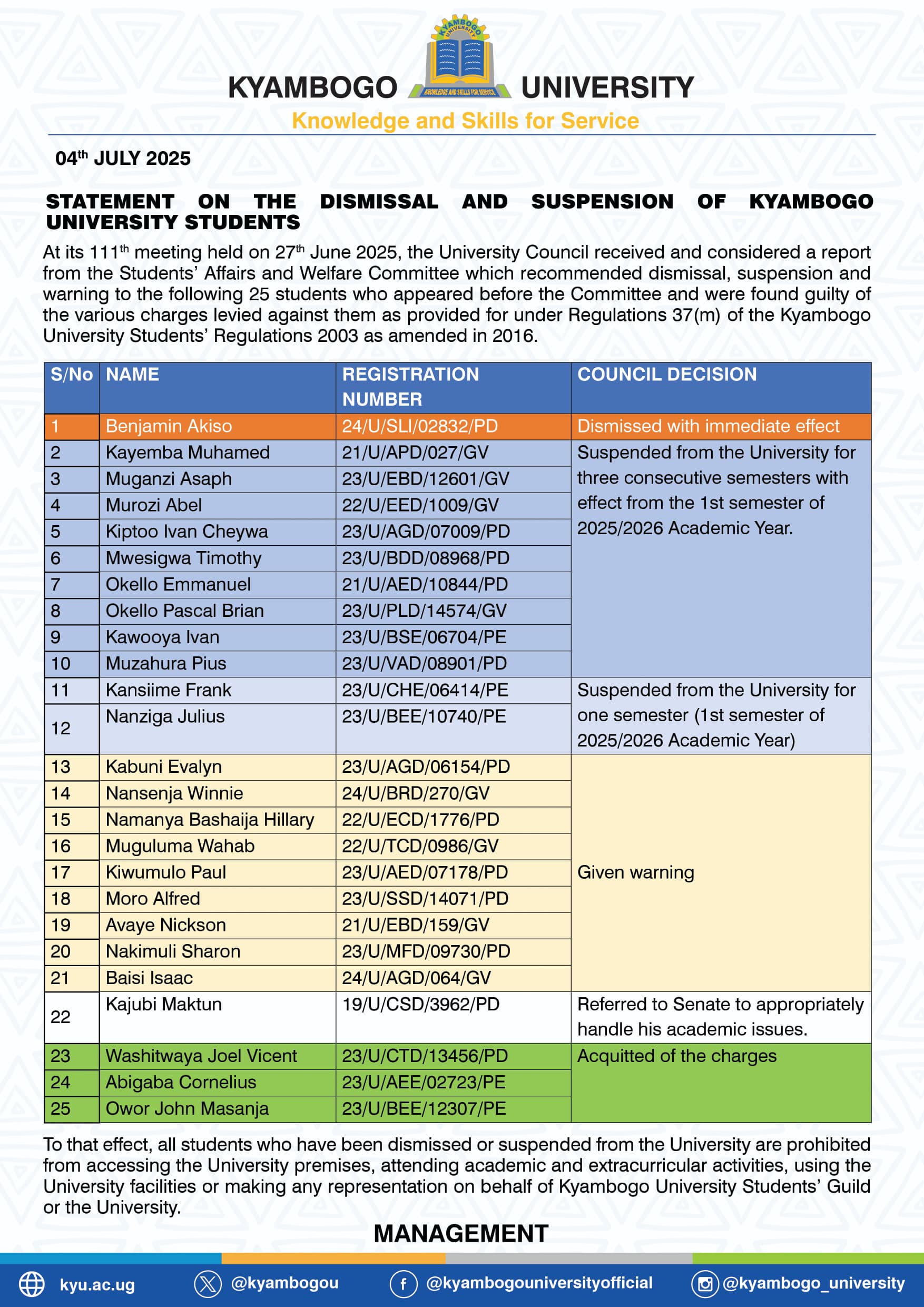 In the following official statement, Kyambogo University has rendered a detailed explanation justifying the recent dismissal of students: