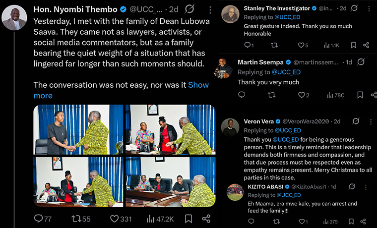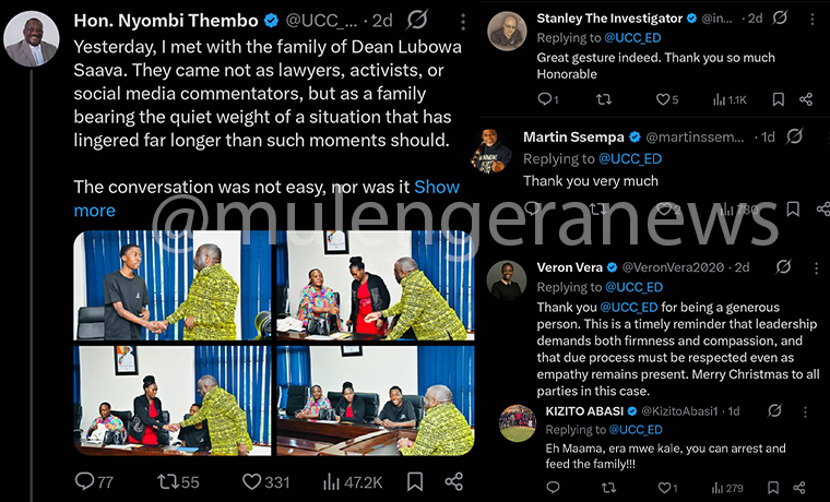 On Tuesday 23rd December, the UCC Executive Director Hon GW Nyombi Thembo posted on his X about the private meeting he had had with close family members of jailed journalist and online broadcaster Dean Lubowa Saava.