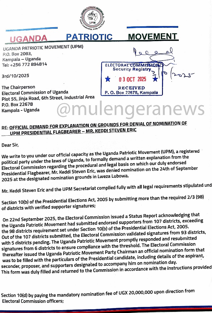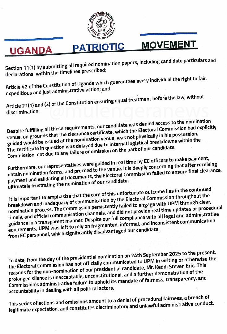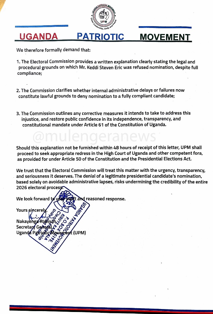 According to the letter dated 3th October 2025 addressed to Electoral commission chairperson, UPM seeks reasons for the non- nomination of their candidate despite of fulfilling all requirements.
