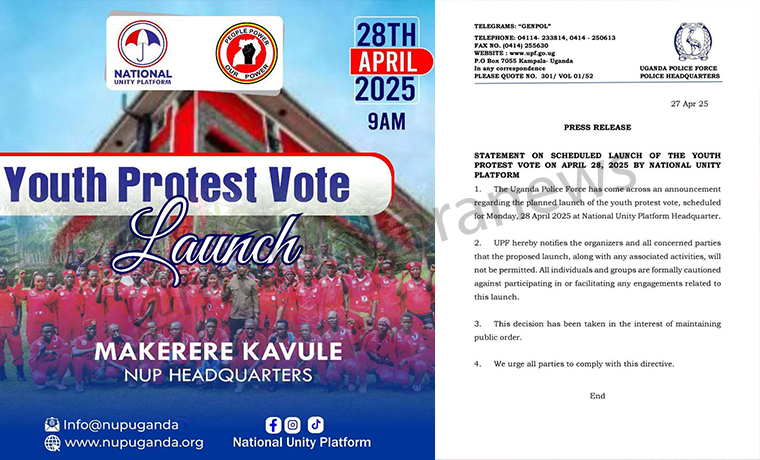 The Uganda Police Force has blocked the National Unity Platform’s (NUP) planned launch of the “Youth Protest Vote” campaign, scheduled for Monday, April 28, 2025, at the party’s Makerere Kavule headquarters.