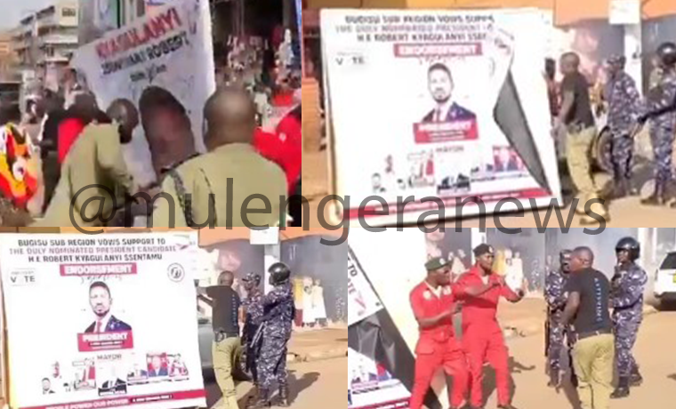 NUP supporters were seen marching with placards and posters of Kyagulanyi before being dispersed by security personnel. In the process, several campaign materials, including posters bearing Kyagulanyi’s image, appeared to be torn or destroyed by officers—some in uniform and others in plain clothes.