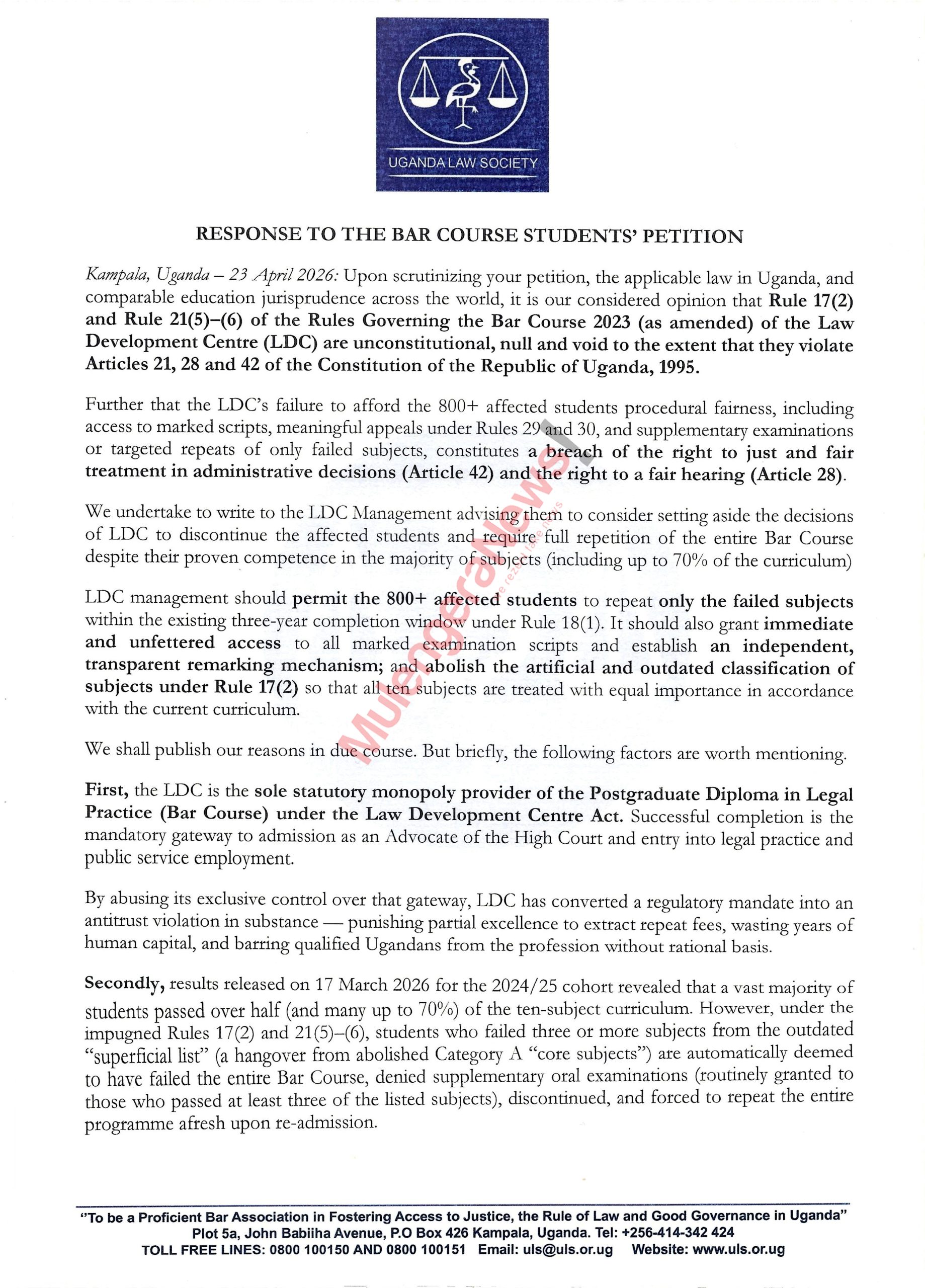 The Uganda Law Society said it will formally communicate its recommendations to the LDC management and publish detailed legal reasoning in due course. It has urged reforms to ensure fairness, transparency, and proportionality in Bar Course administration.