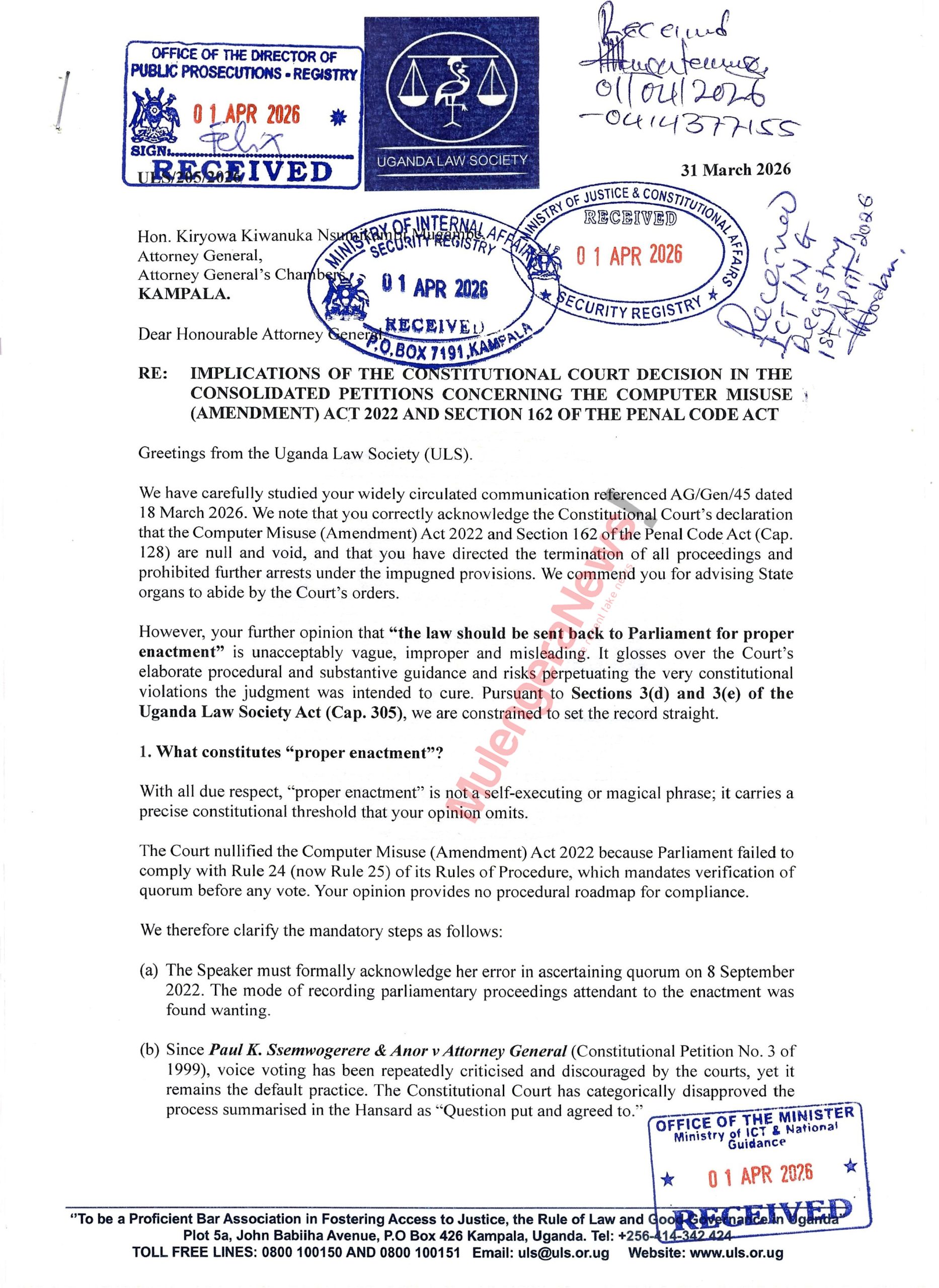 The Uganda Law Society (ULS) has sharply criticized guidance issued by Attorney General Kiryowa Kiwanuka following a landmark ruling by the Constitutional Court of Uganda that nullified the Computer Misuse (Amendment) Act 2022 and Section 162 of the Penal Code Act.