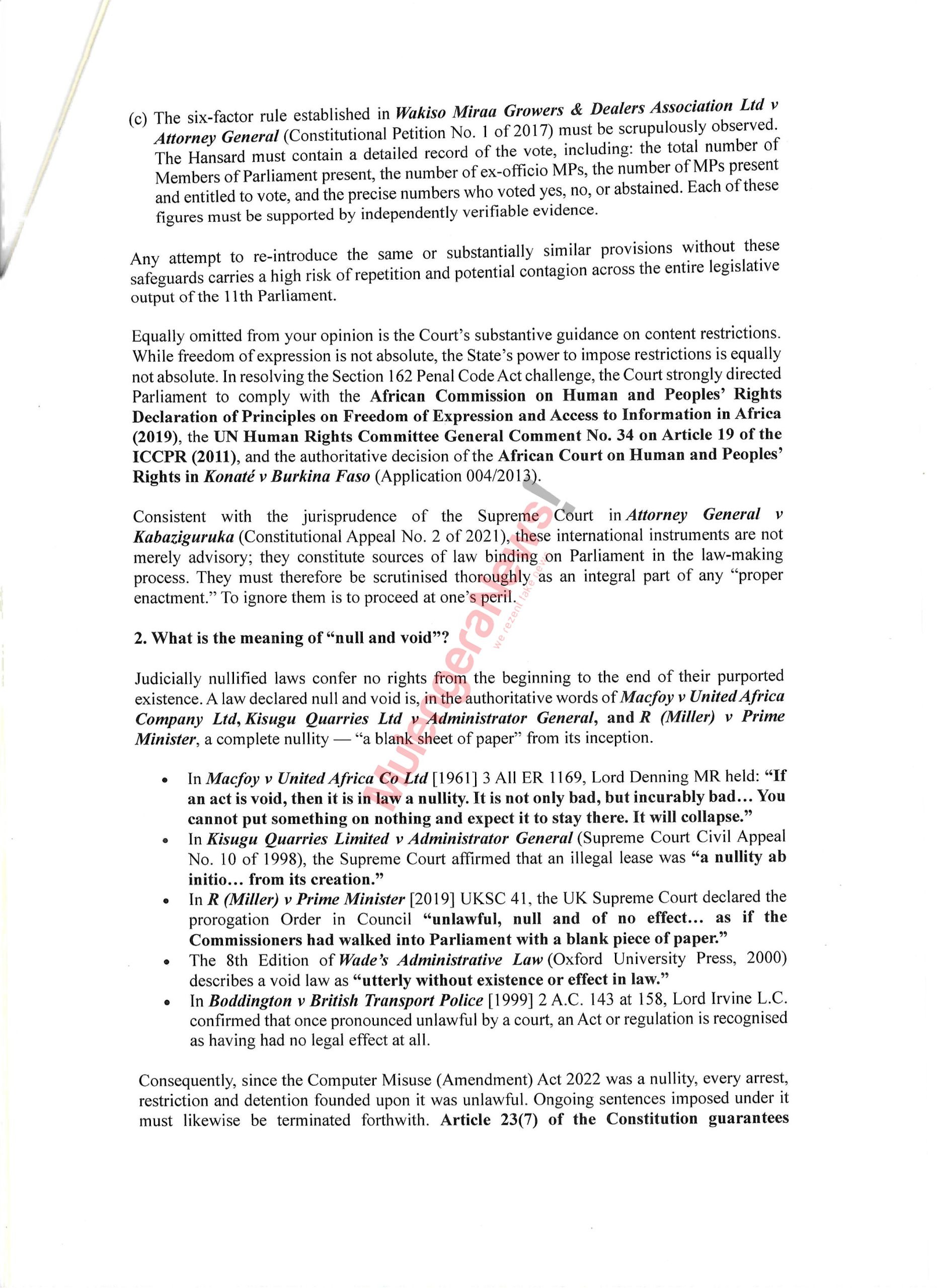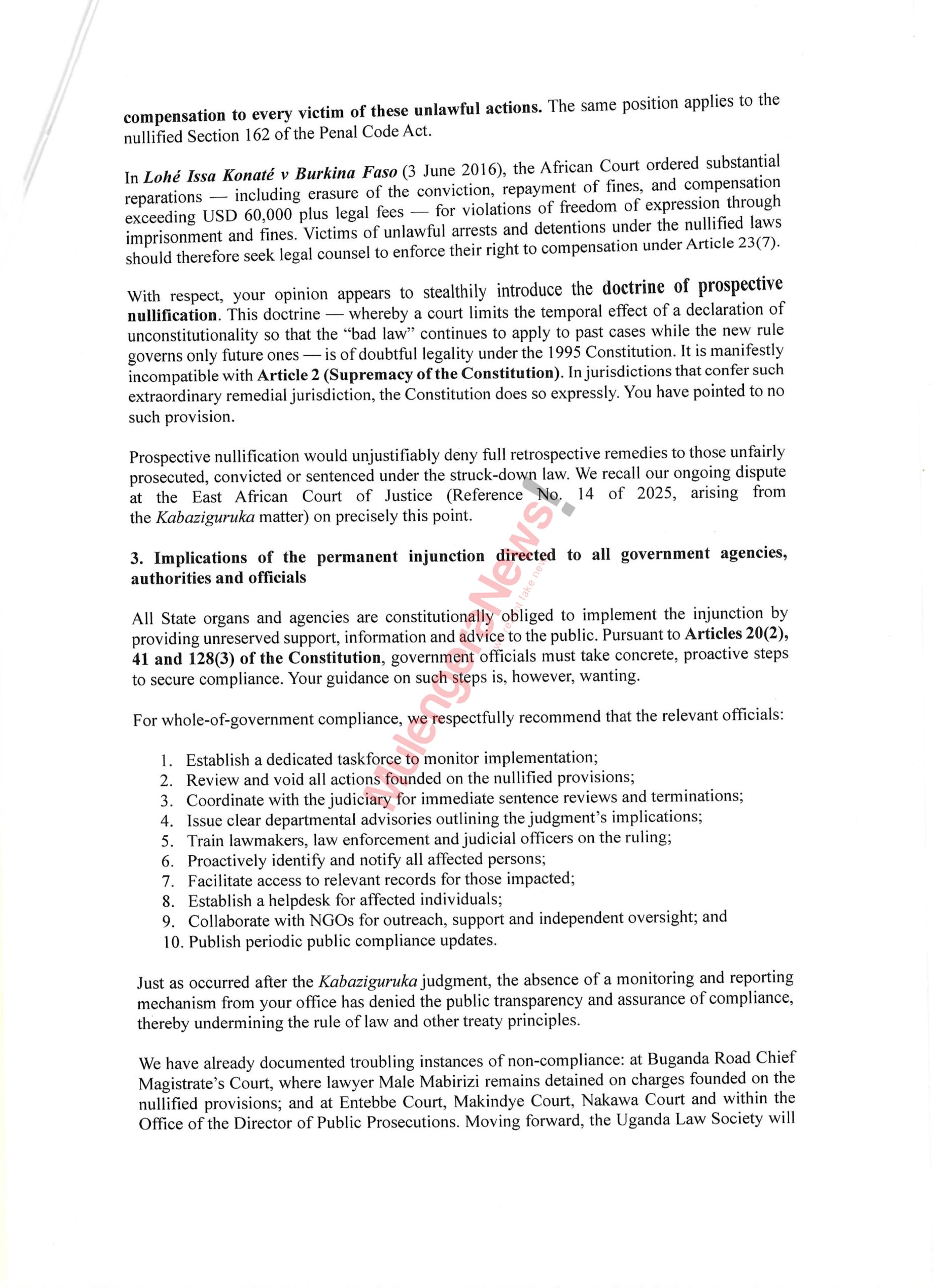 The letter further warned against any attempt to apply the doctrine of prospective nullification, which would limit the ruling’s effect to future cases. Ssemakadde argued that such an approach is inconsistent with Uganda’s constitutional framework and would deny justice to those already affected.