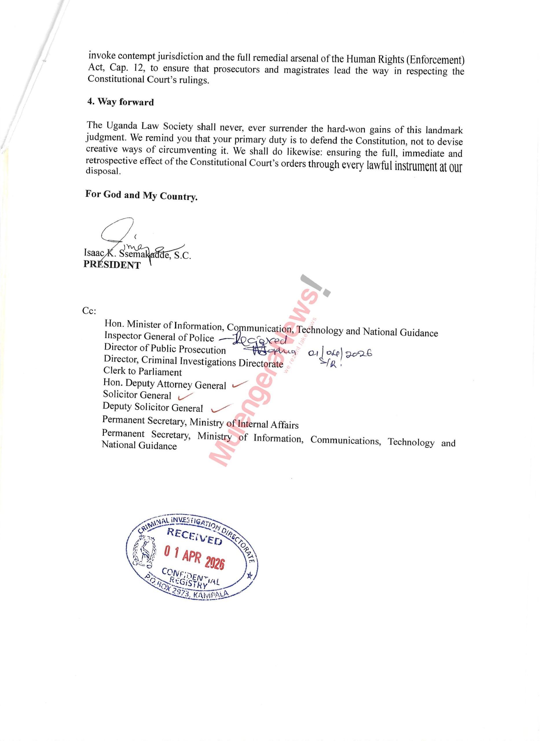 “The Uganda Law Society shall never surrender the hard-won gains of this landmark judgment,” the letter stated, signaling a potential legal standoff between the bar association and government authorities over the enforcement of the court’s decision. (For comments on this story, get back to us on 0705579994 [WhatsApp line], 0779411734 & 041 4674611 or email us at mulengeranews@gmail.com).