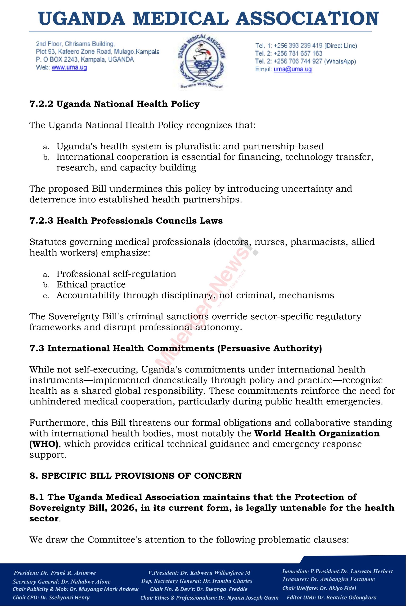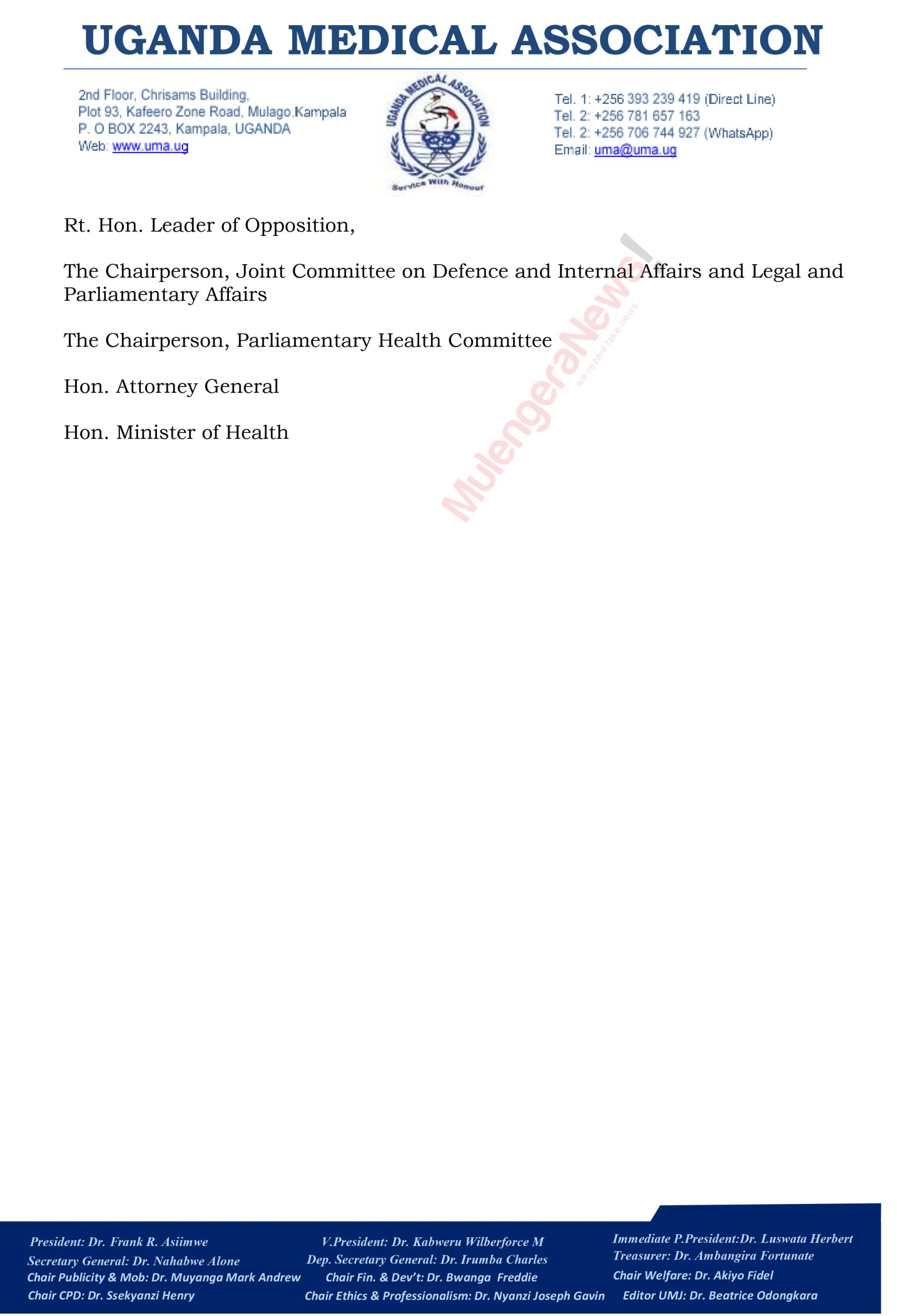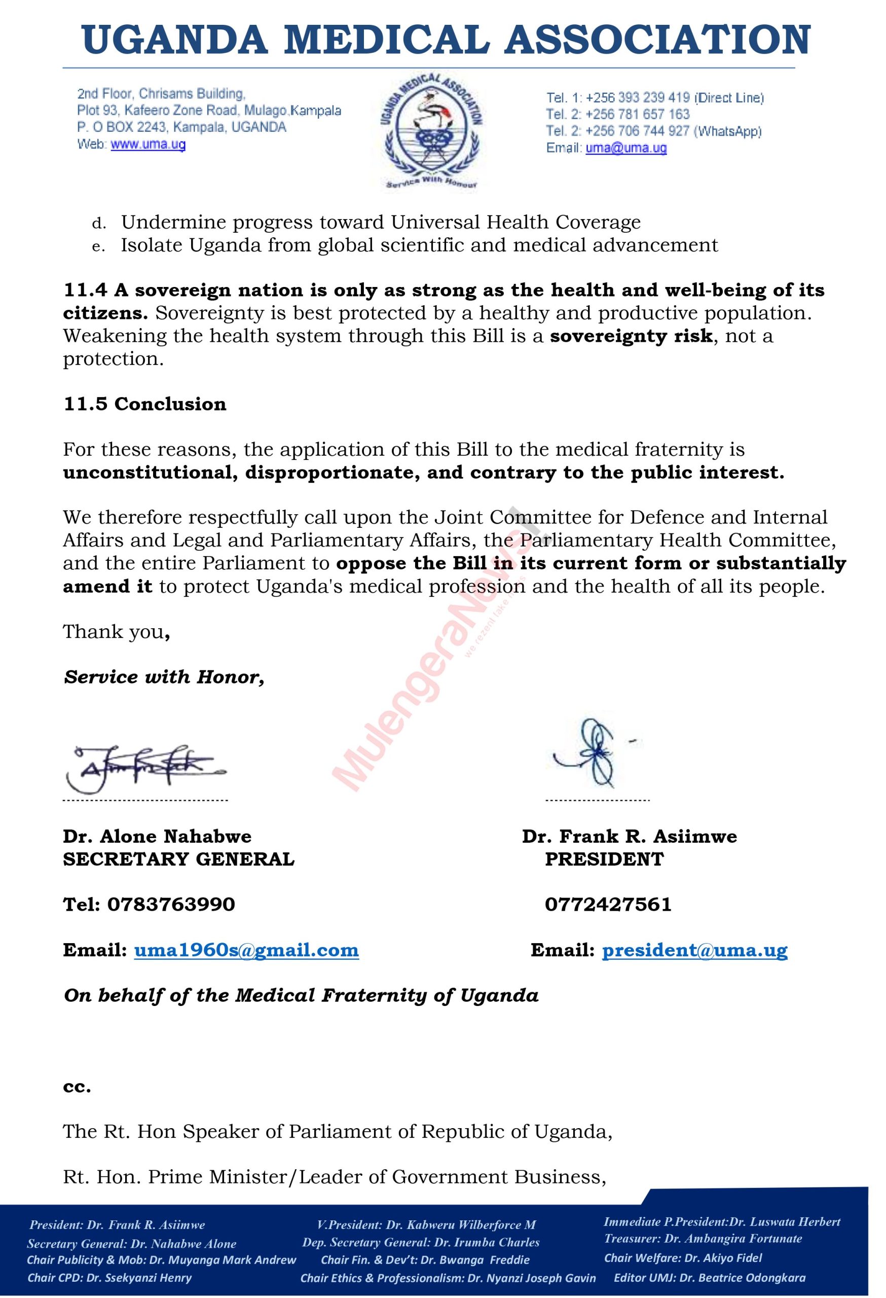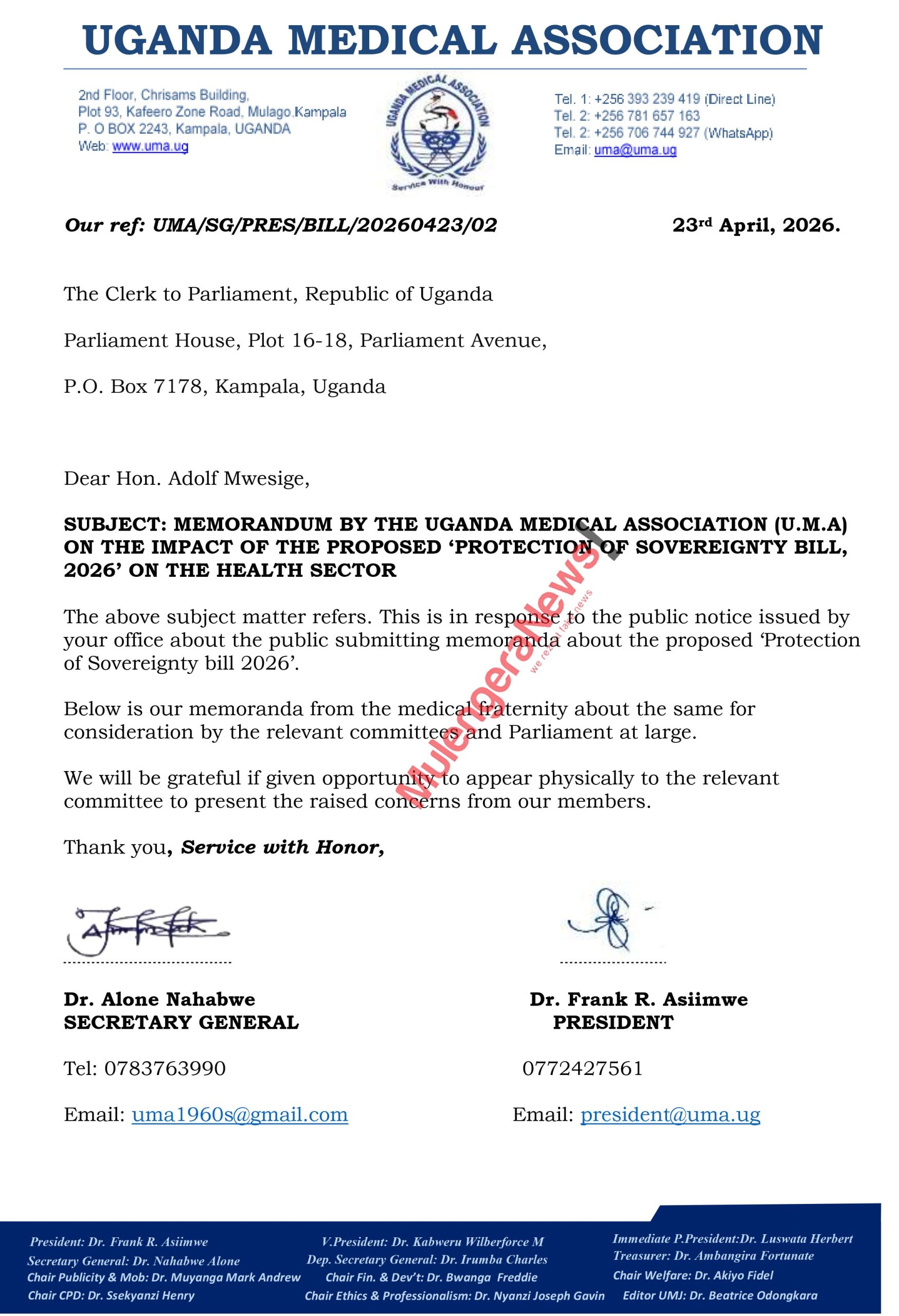 The memorandum, referenced as UMA/SG/PRES/BILL/20260423/02 and dated 23rd April 2026, was signed by the leadership of the Uganda Medical Association. It was authored by Secretary General Dr. Alone Nahabwe and President Dr. Frank R. Asiimwe, who expressed readiness to appear before parliamentary committees to explain the association’s concerns.