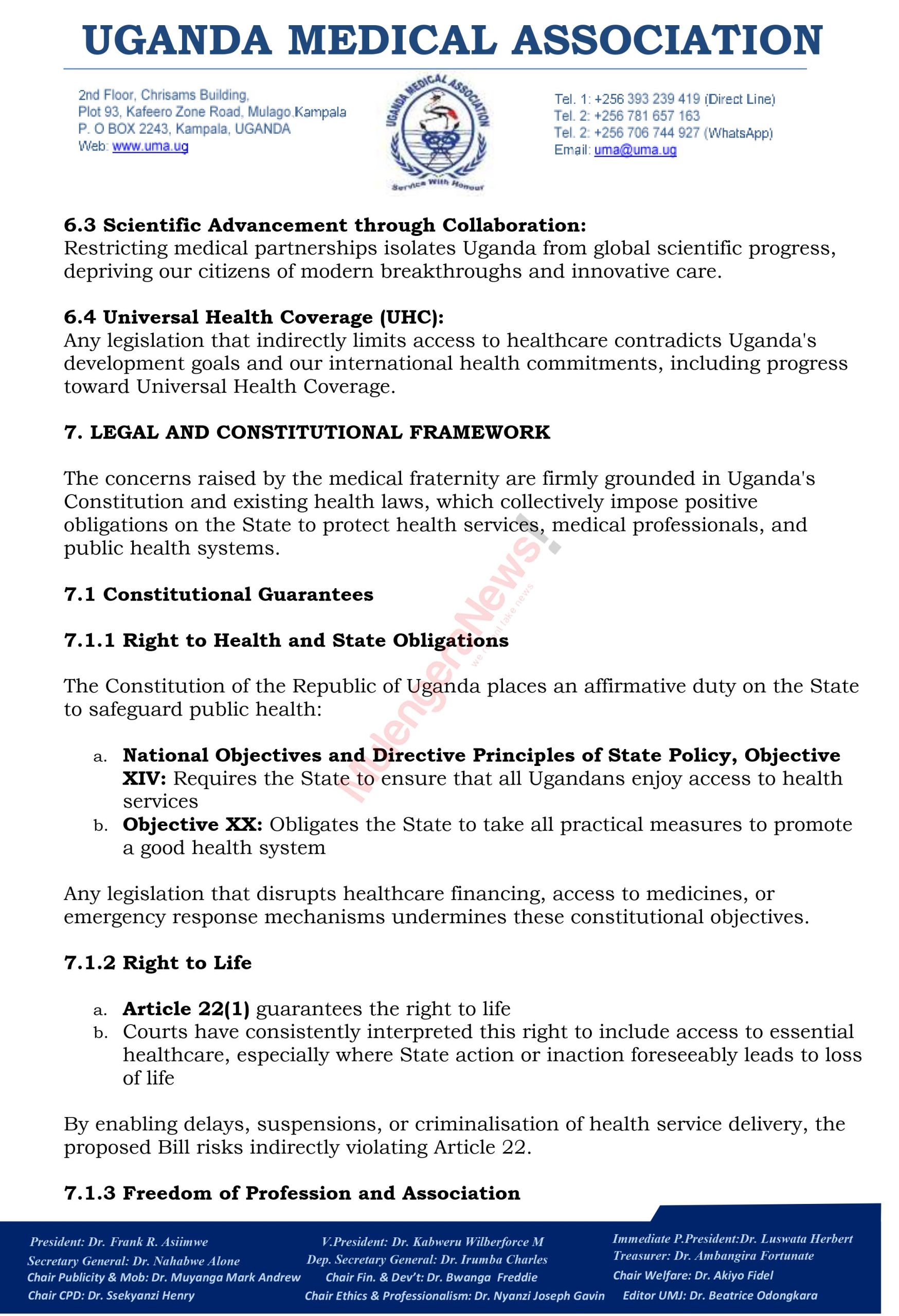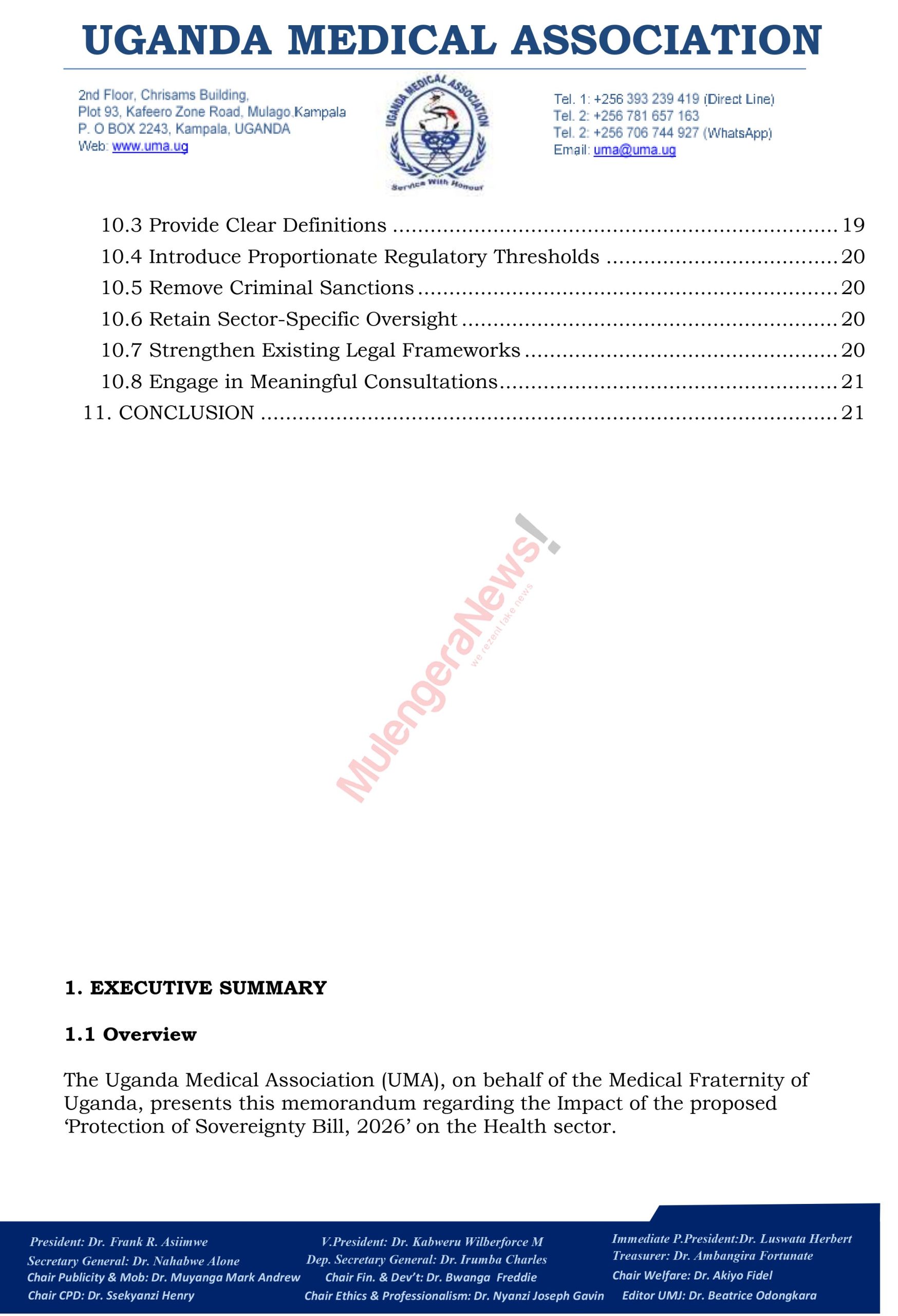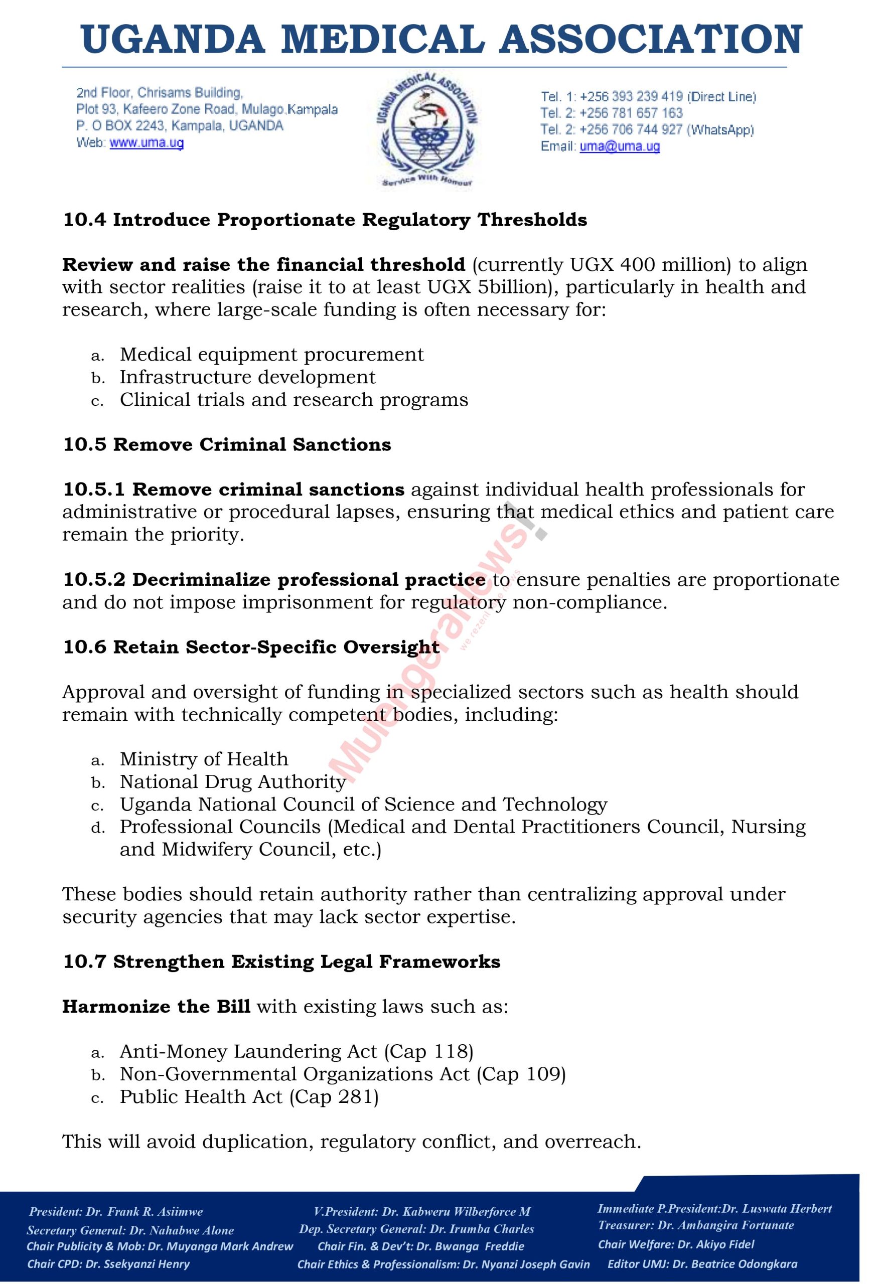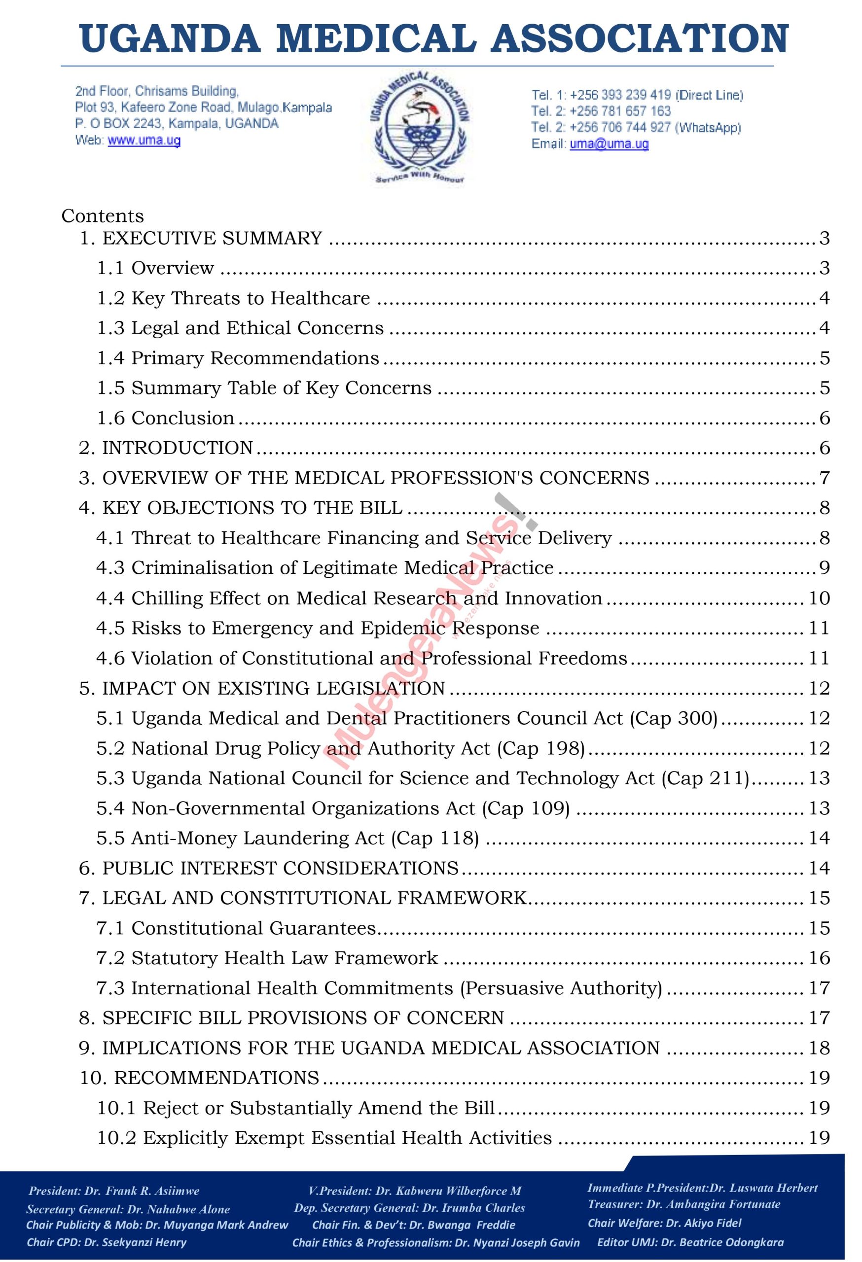 The memorandum, referenced as UMA/SG/PRES/BILL/20260423/02 and dated 23rd April 2026, was signed by the leadership of the Uganda Medical Association. It was authored by Secretary General Dr. Alone Nahabwe and President Dr. Frank R. Asiimwe, who expressed readiness to appear before parliamentary committees to explain the association’s concerns.