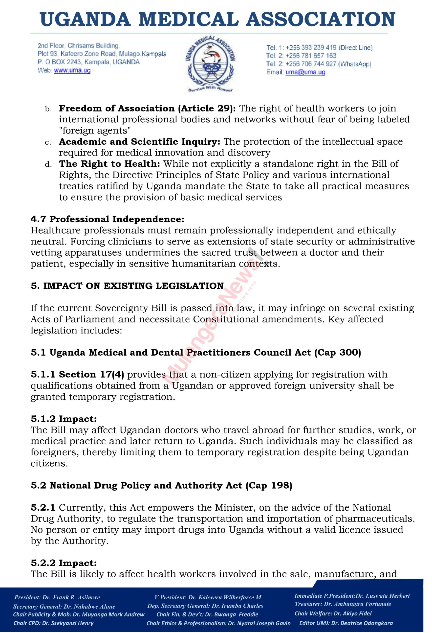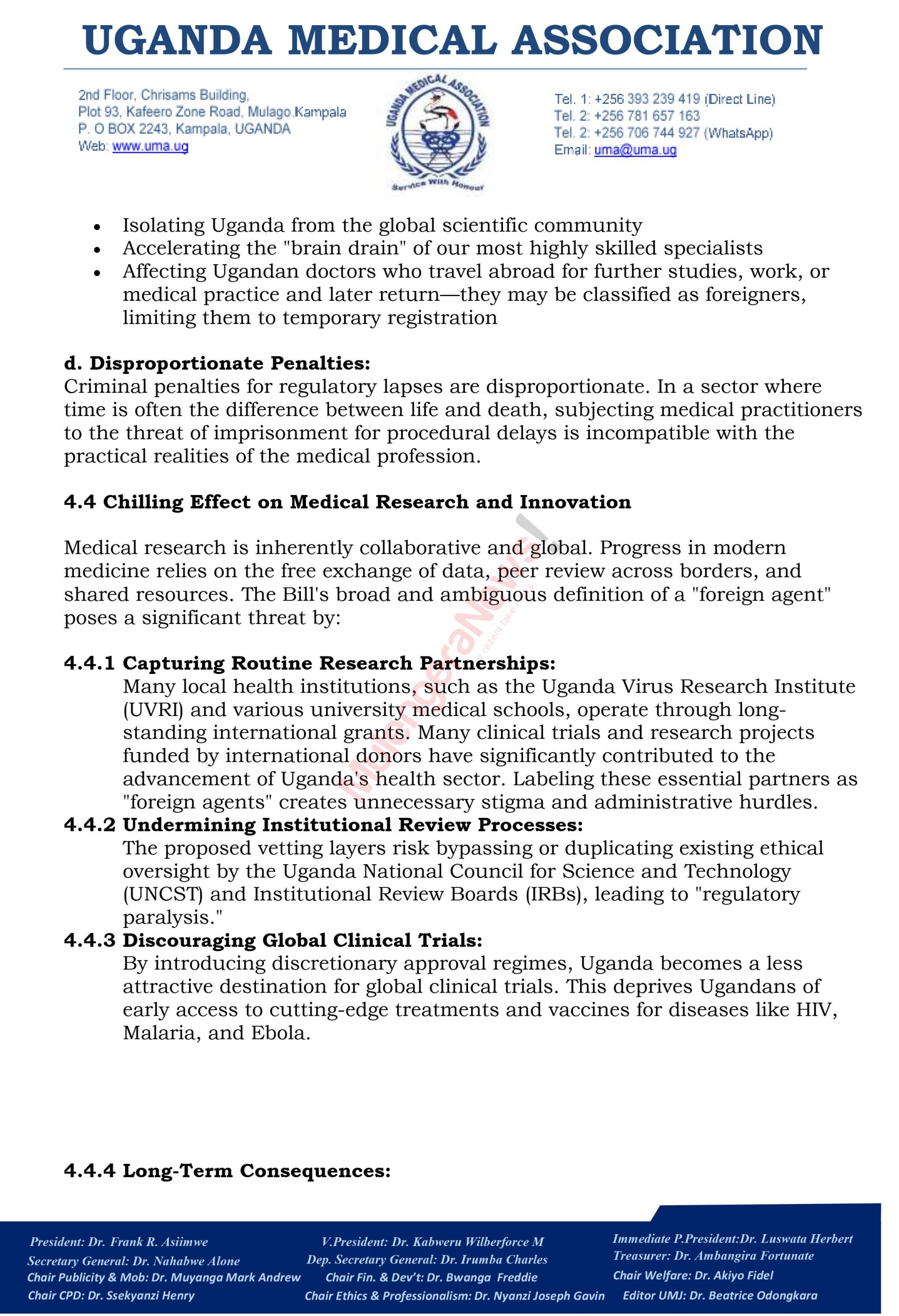 Another major issue raised is the impact on medical research and innovation. The association said the Bill’s broad definition of a “foreign agent” could wrongly include doctors and institutions involved in normal research partnerships with international organizations. This, they warned, could discourage clinical trials, limit innovation, and isolate Uganda from global medical progress.