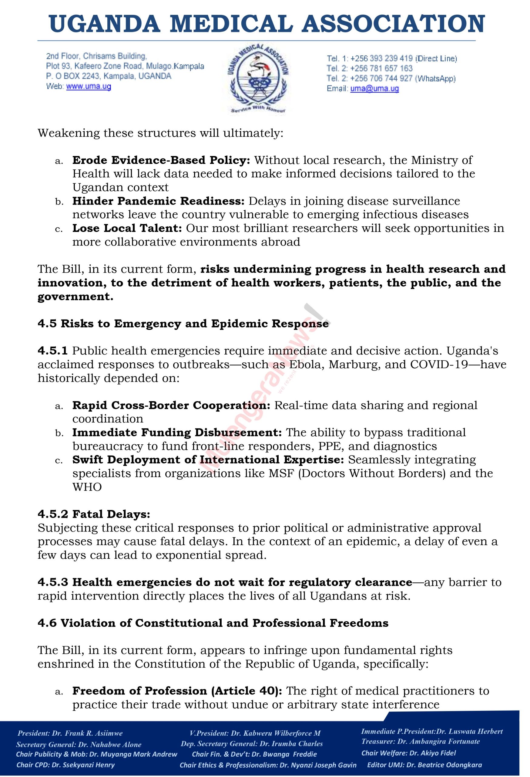 UMA also raised alarm over potential delays in emergency response. The association explained that during outbreaks such as Ebola, Marburg, or COVID-19, Uganda depends on quick access to international expertise, funding, and medical supplies. Introducing long approval processes, they said, could delay urgent action and lead to preventable deaths.