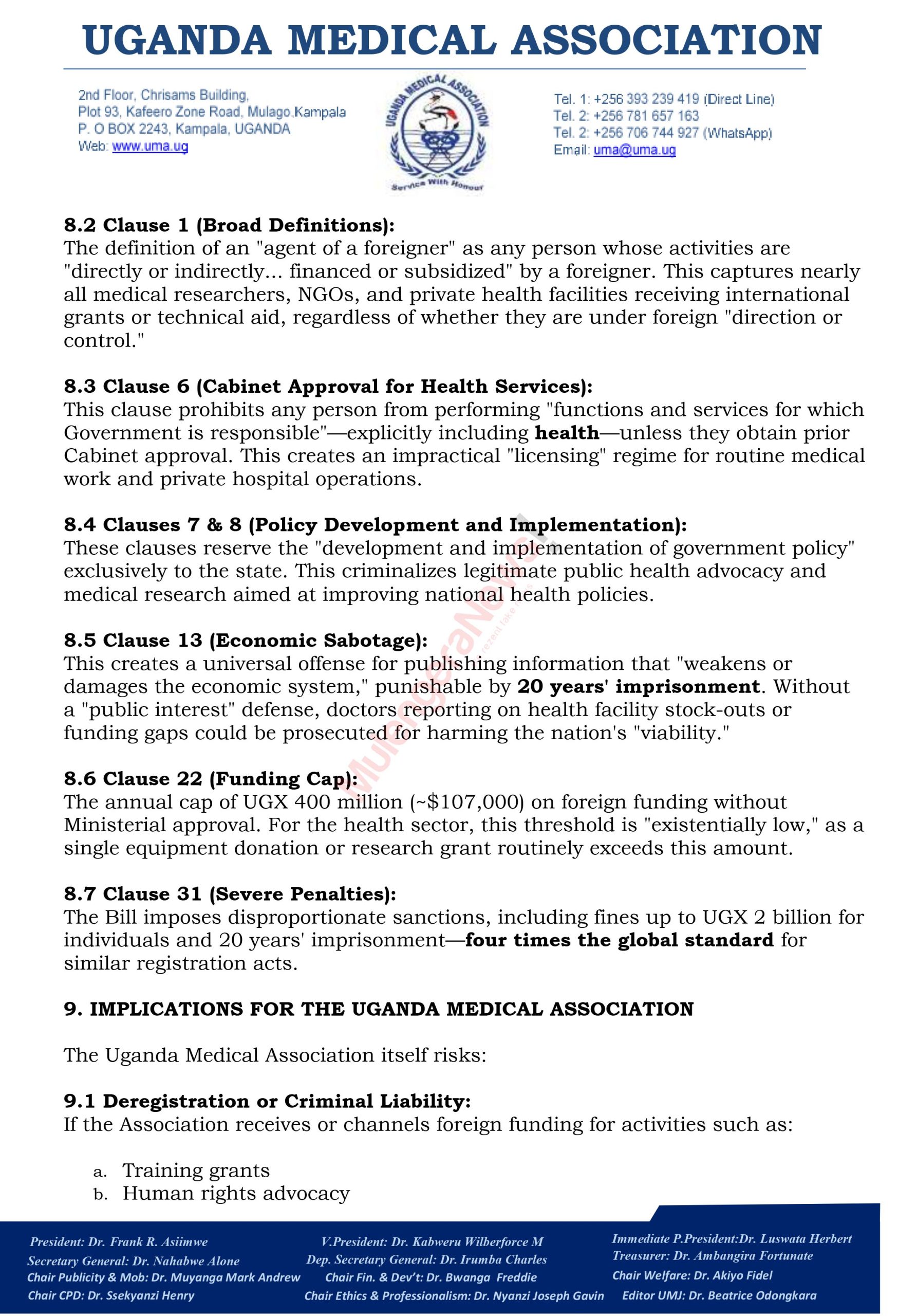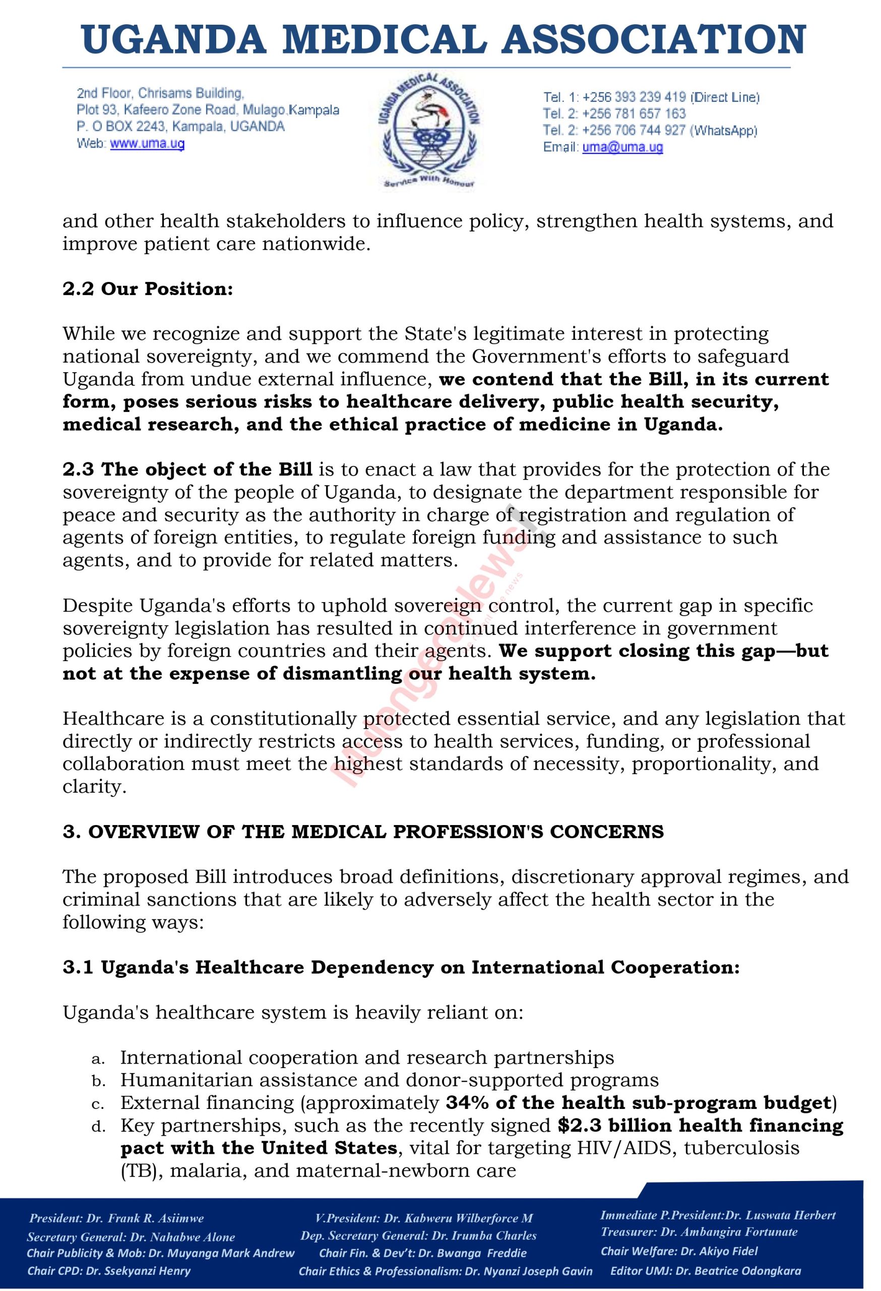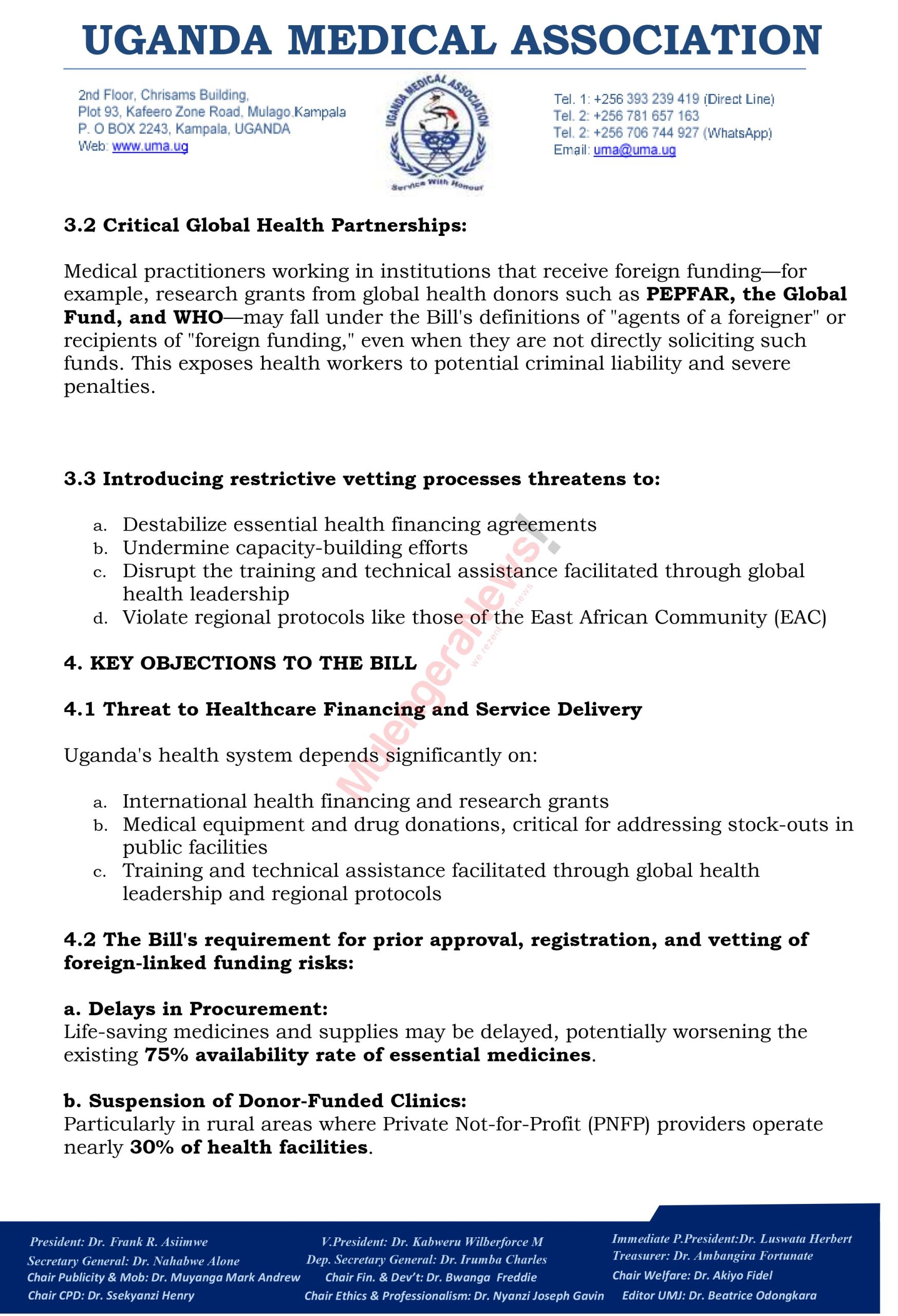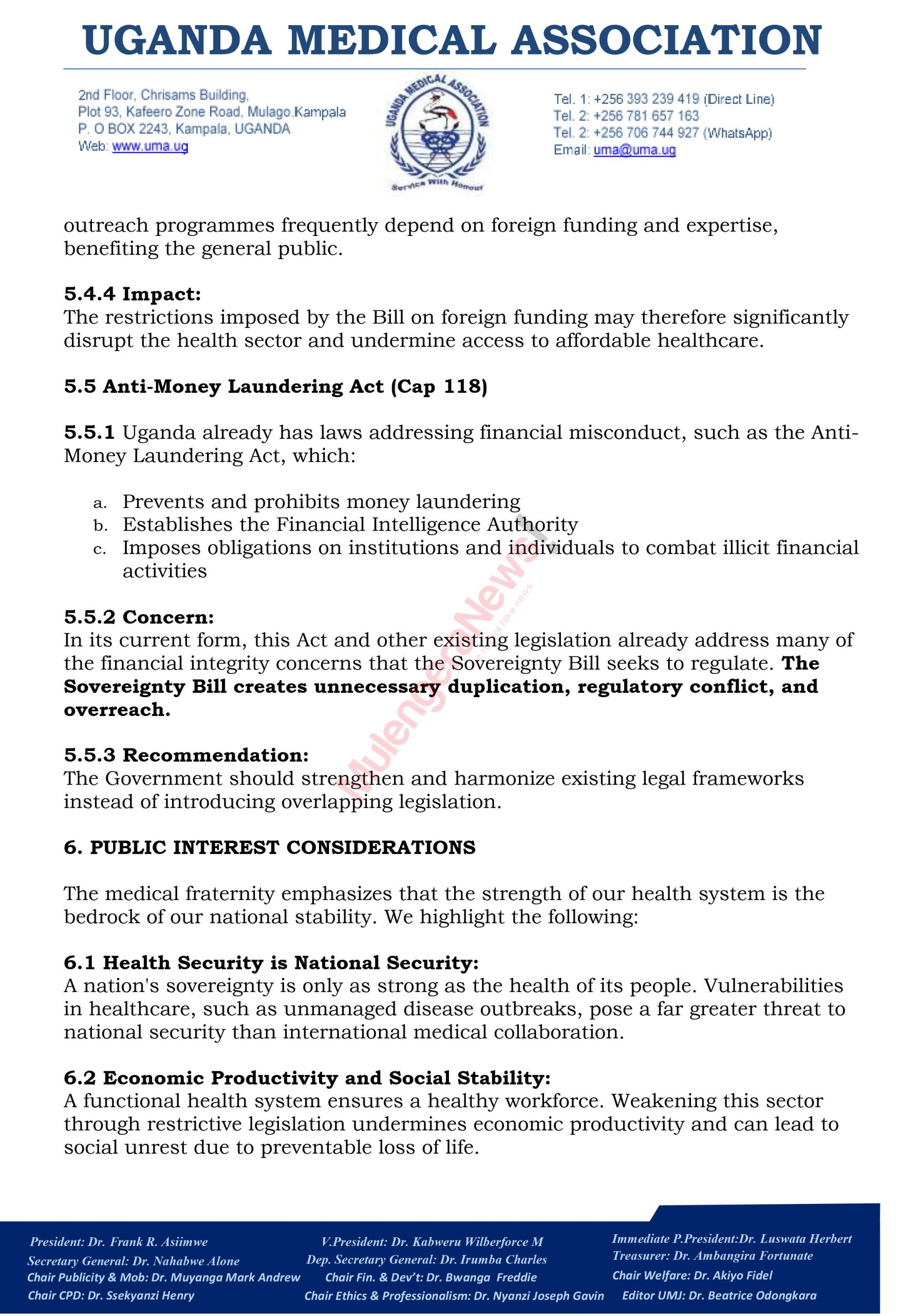While acknowledging the government’s intention to protect Uganda from foreign interference, UMA warned that the current draft of the Bill could unintentionally harm the health sector more than protect the country.