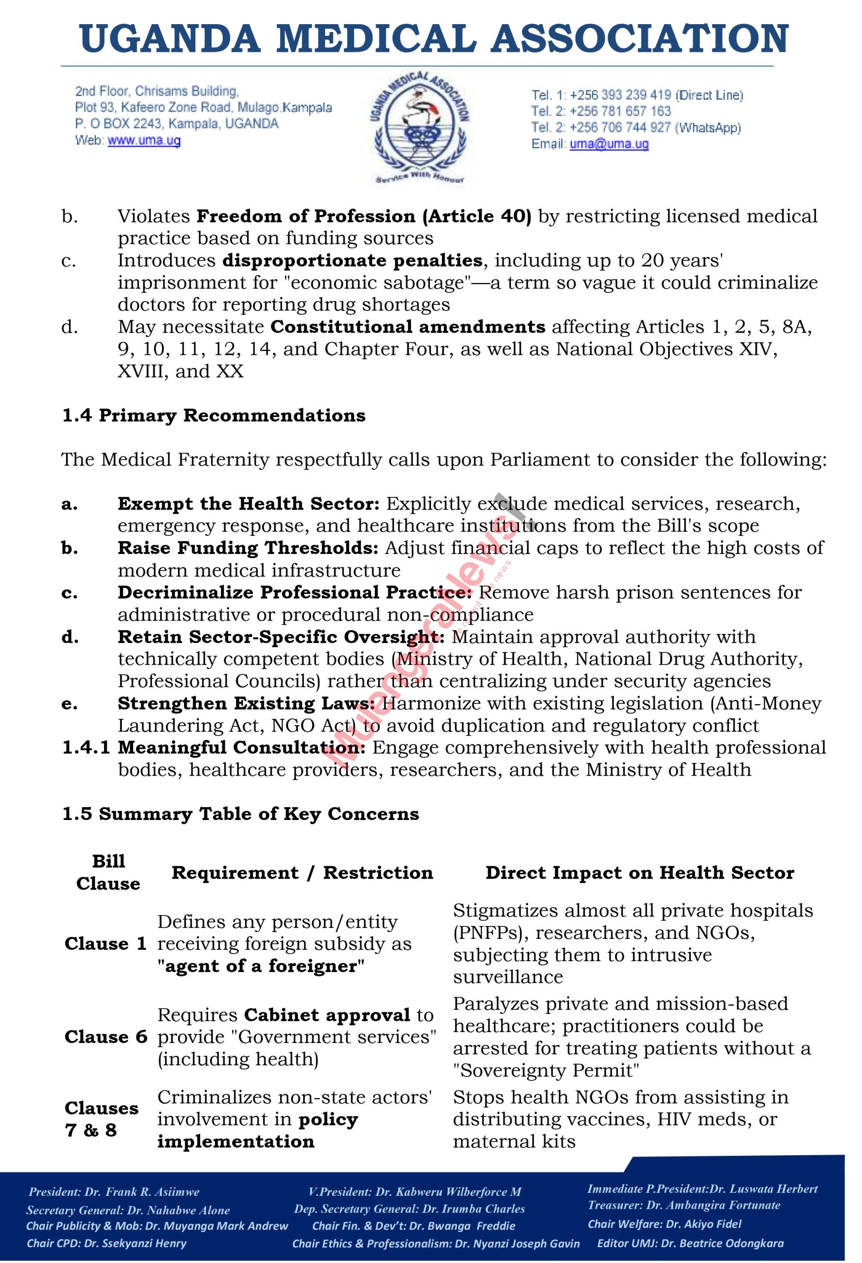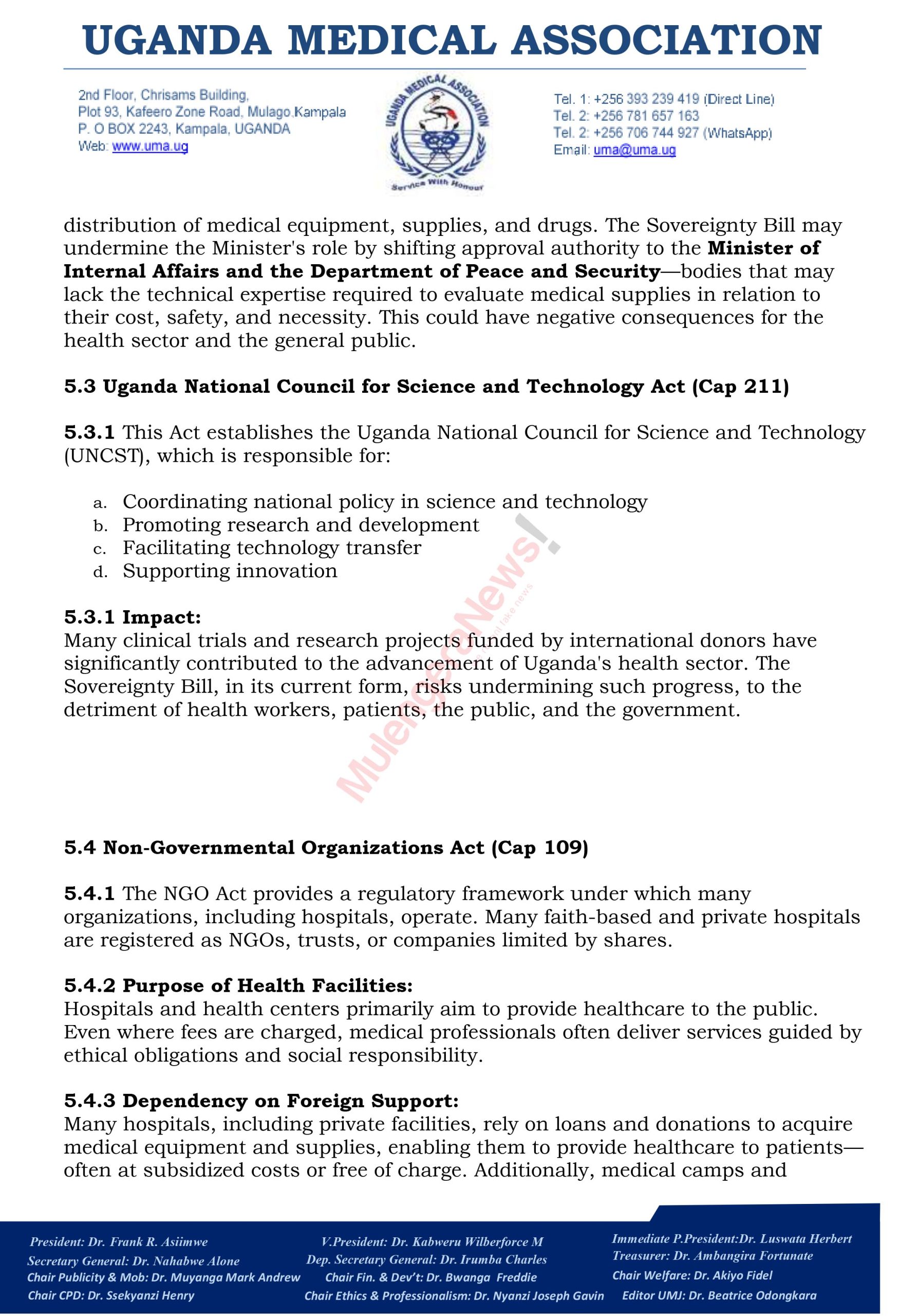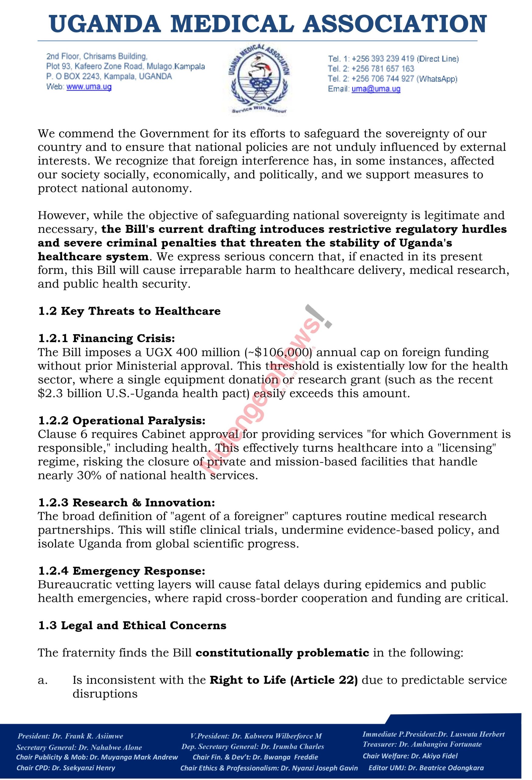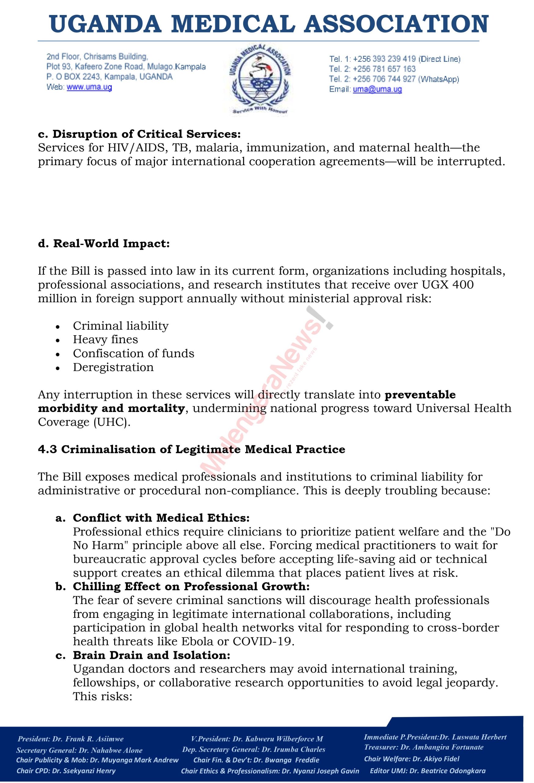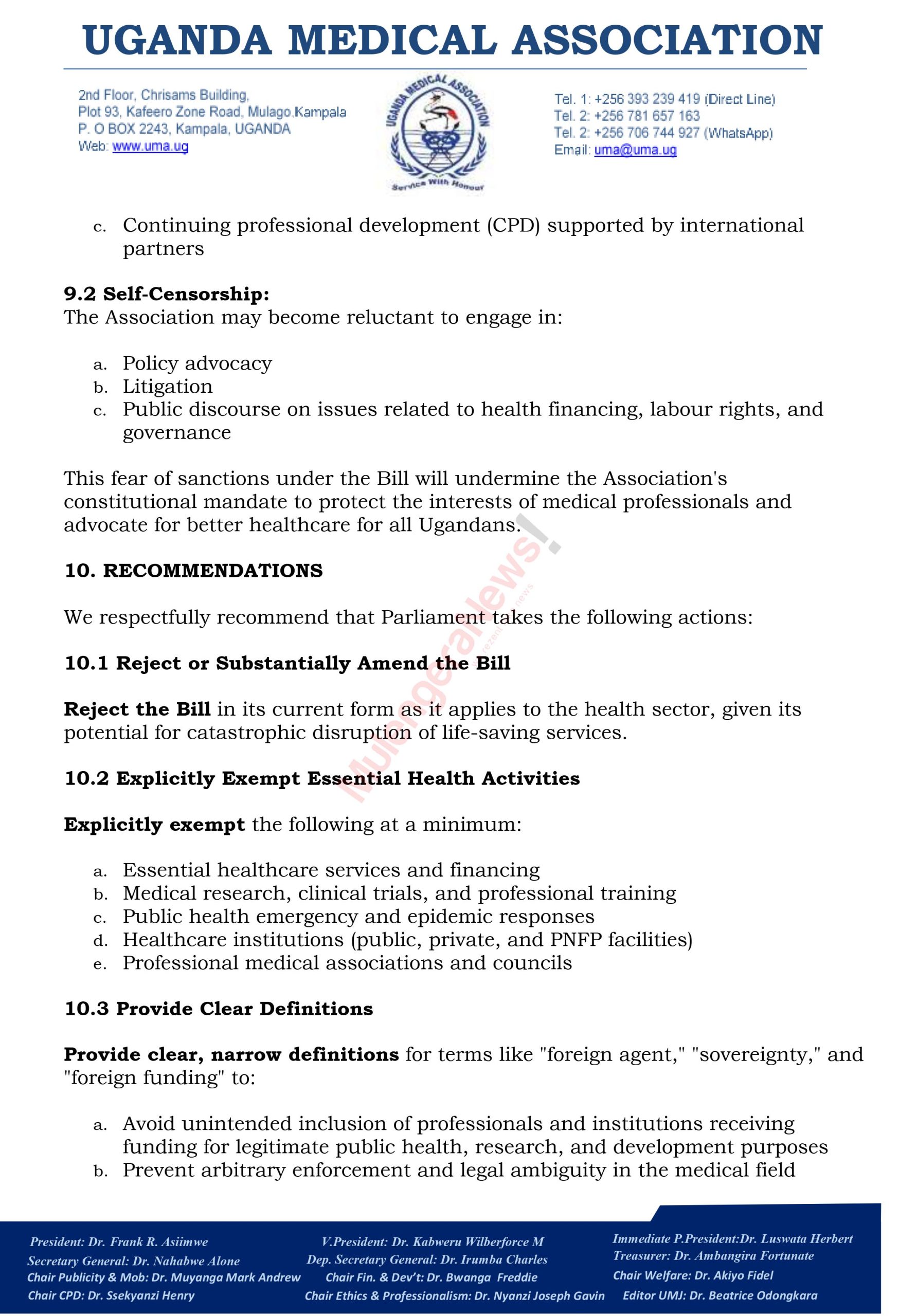 While acknowledging the government’s intention to protect Uganda from foreign interference, UMA warned that the current draft of the Bill could unintentionally harm the health sector more than protect the country.