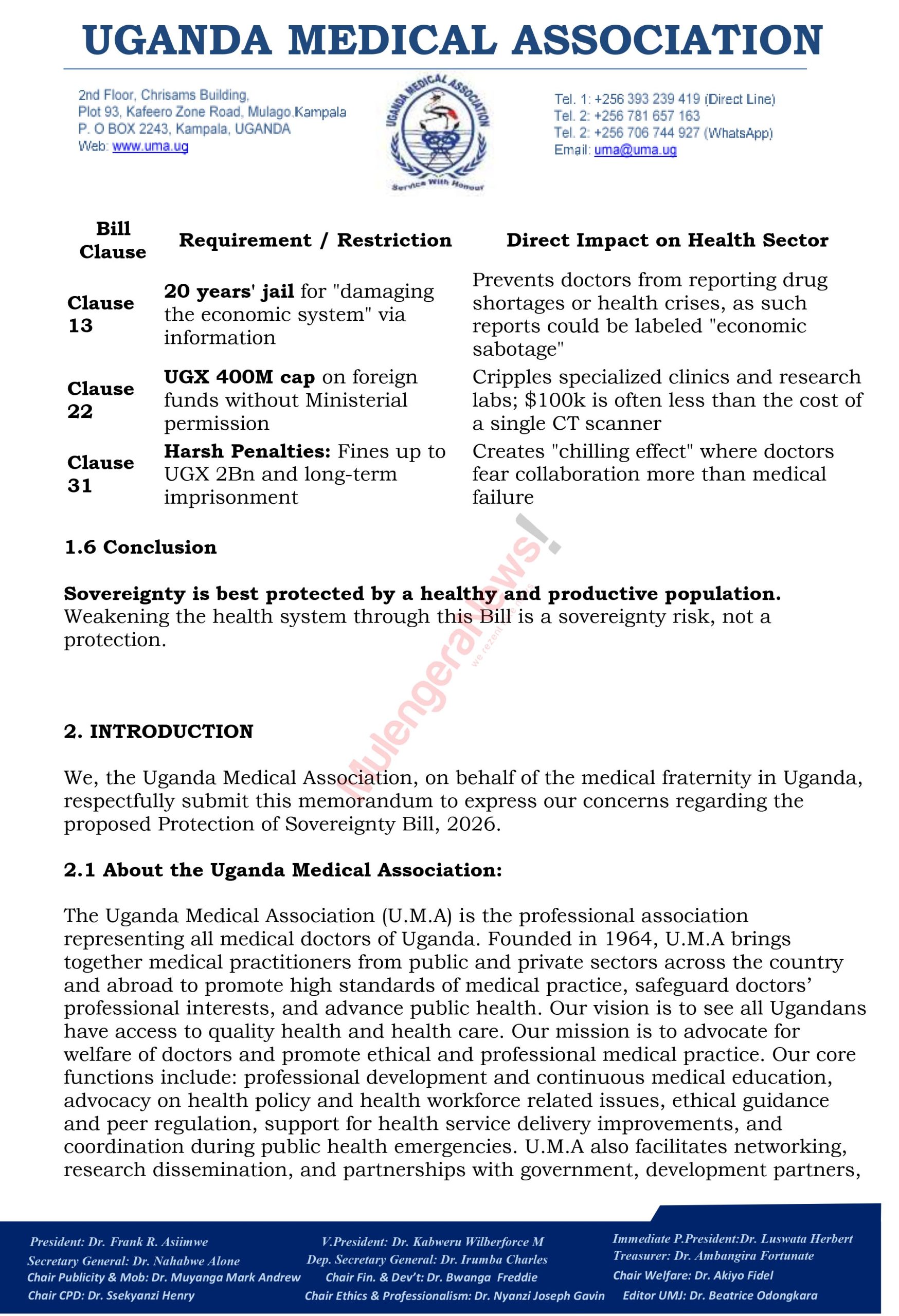 The Uganda Medical Association (UMA) has raised strong concern over the proposed ‘Protection of Sovereignty Bill, 2026’, warning that if passed in its current form, it could seriously disrupt Uganda’s healthcare system, medical research, and emergency health response.