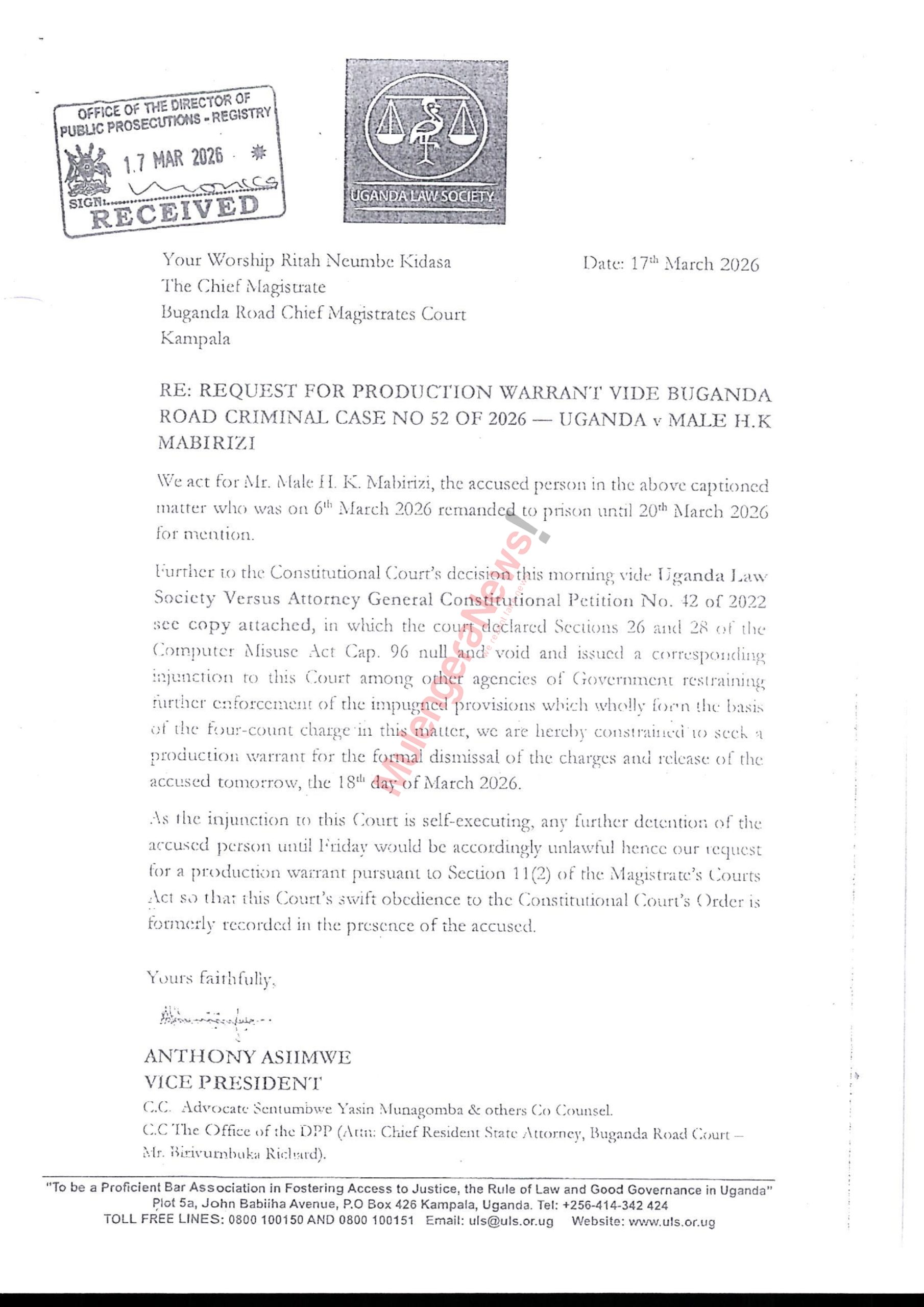 At the center of their complaint is a Constitutional Court judgment delivered on March 17, 2026, which declared key provisions of the Computer Misuse Act invalid. These provisions had formed the basis of the charges in the case before Her Worship Neumbe Ritah Kidasa.