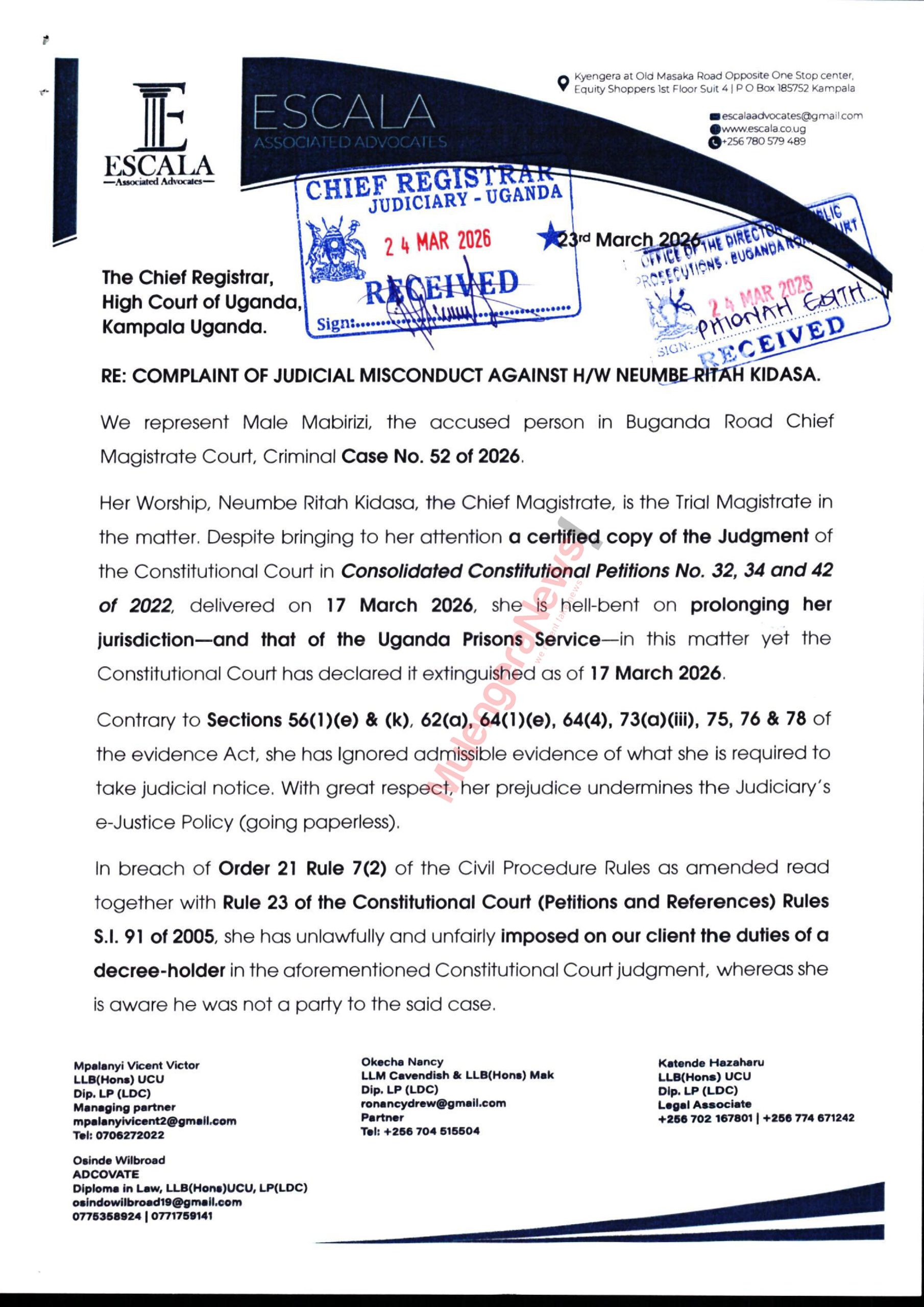 In their complaint, the lawyers are demanding that the judiciary act swiftly, urging the Chief Registrar to intervene and compel Her Worship Neumbe Ritah Kidasa to take corrective steps or face disciplinary action.