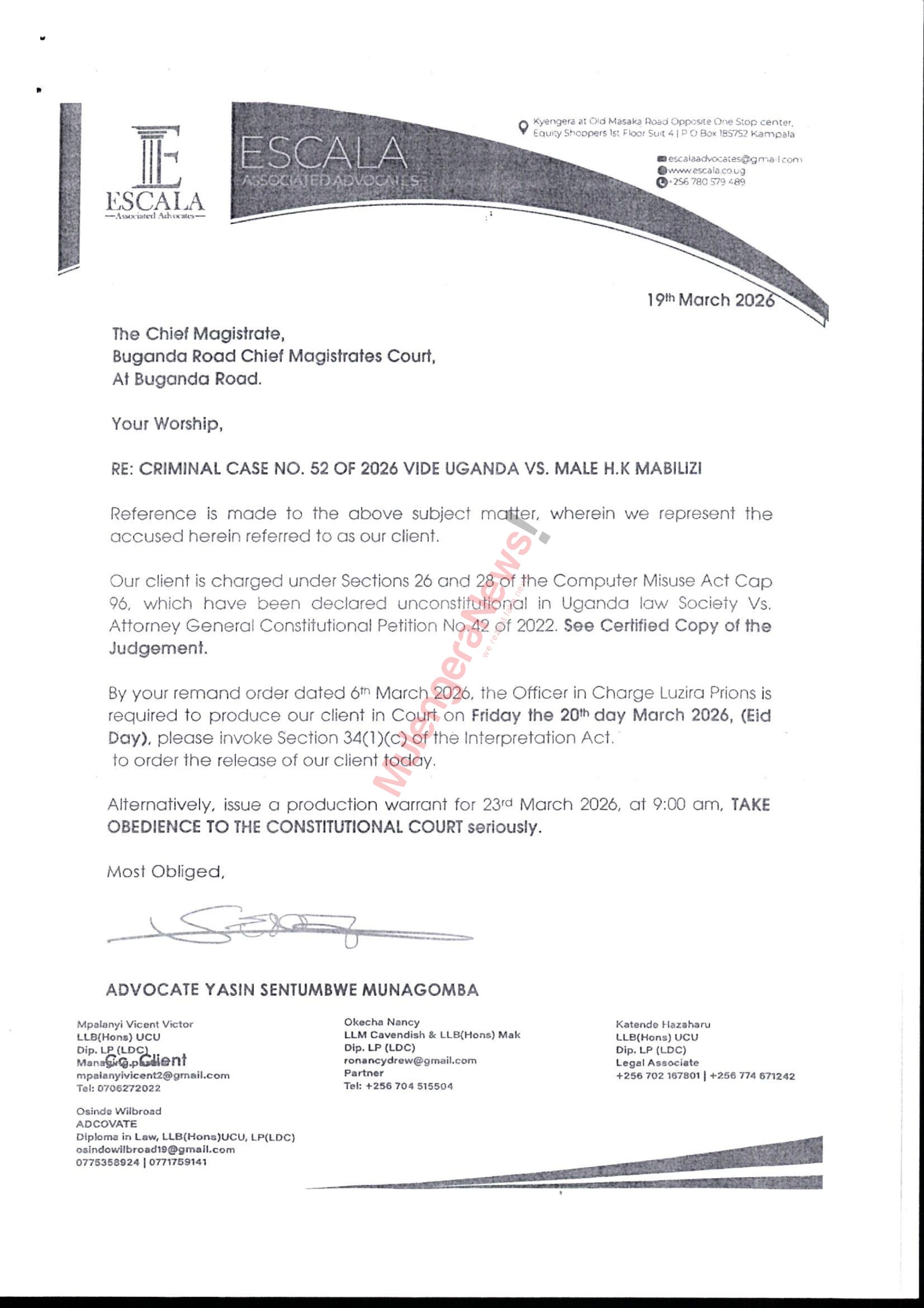 At the center of their complaint is a Constitutional Court judgment delivered on March 17, 2026, which declared key provisions of the Computer Misuse Act invalid. These provisions had formed the basis of the charges in the case before Her Worship Neumbe Ritah Kidasa.