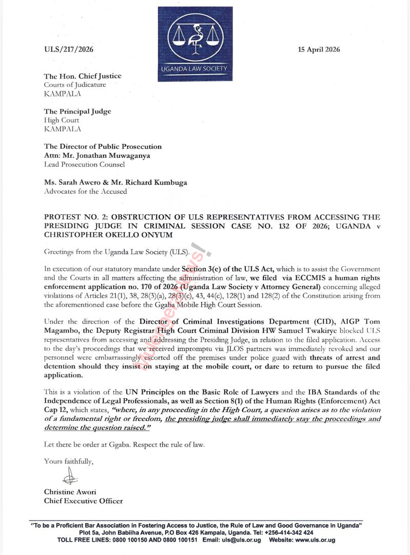 In a letter dated April 15, 2026, addressed to the Chief Justice, the Principal Judge, and the Director of Public Prosecutions, the Chief Executive Officer of the Uganda Law Society, Christine Awori, detailed how the Society’s representatives were denied access to the court and prevented from addressing the presiding judge regarding the application.